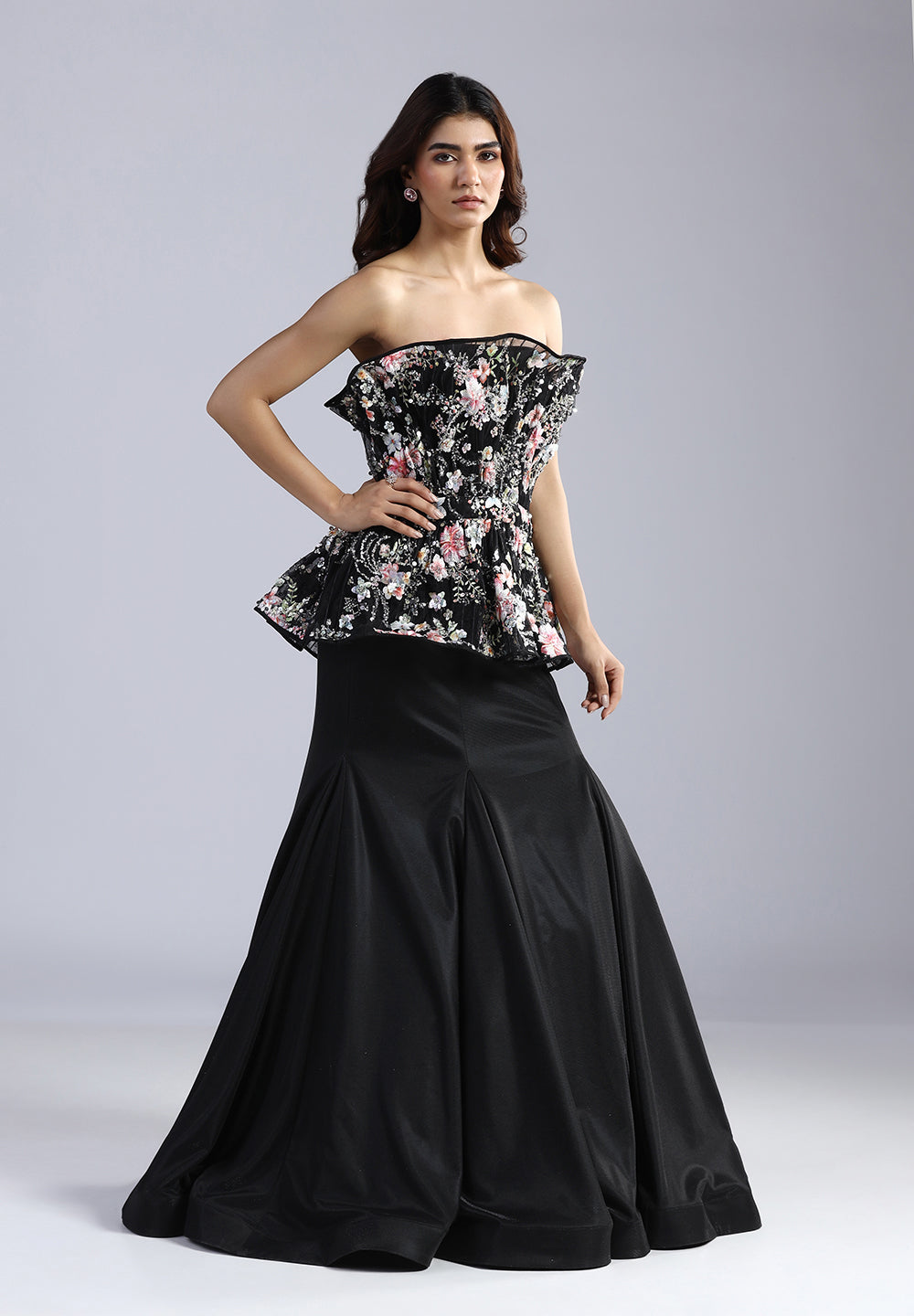 This sophisticated readymade ensemble combines the playful texture of a peplum bodice with the dramatic silhouette of a mermaid-style evening gown.