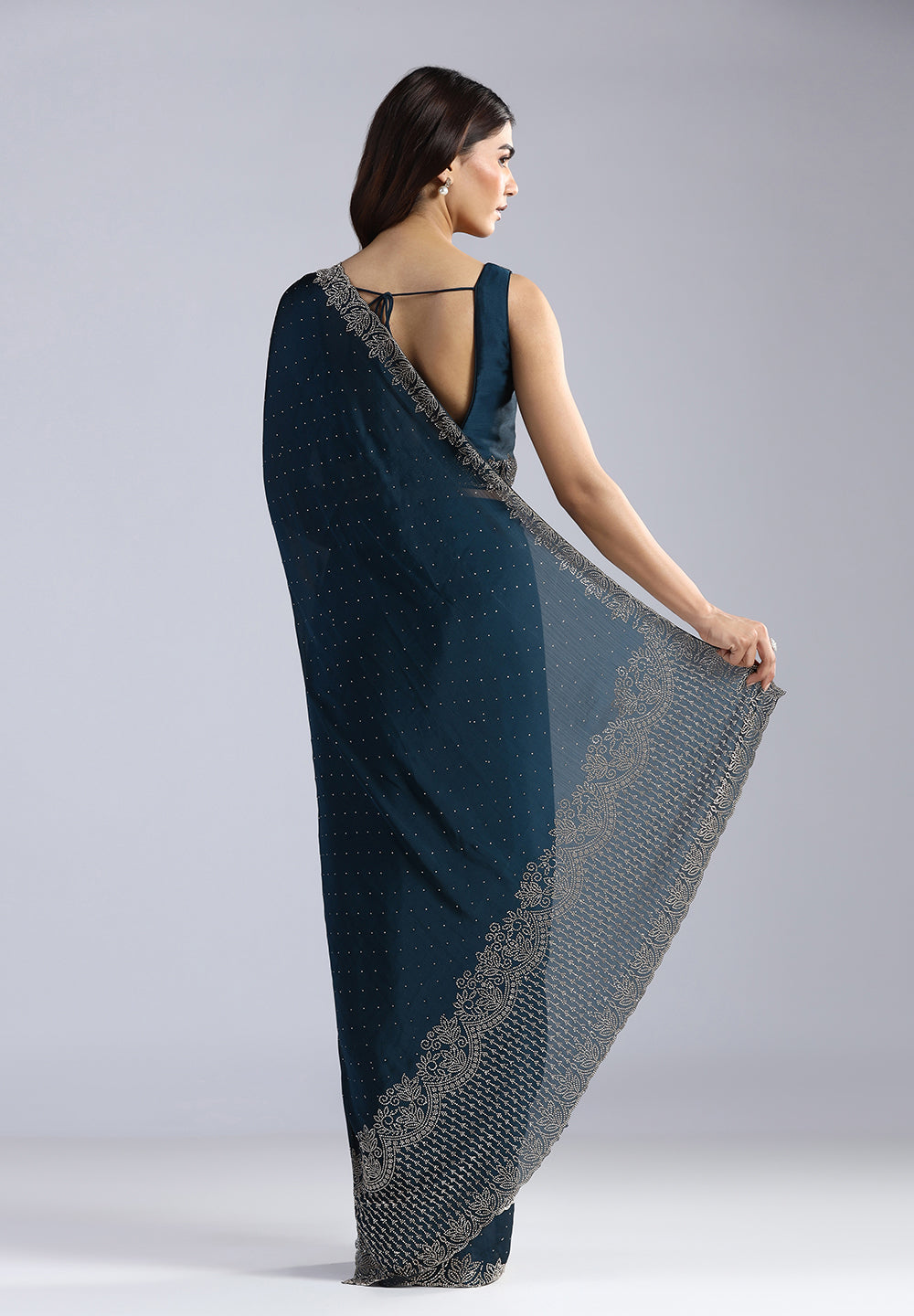 - Intricate Swarovski Embellishments: The saree is adorned with delicate Swarovski stonework scattered across the body, creating a subtle yet captivating shimmer
