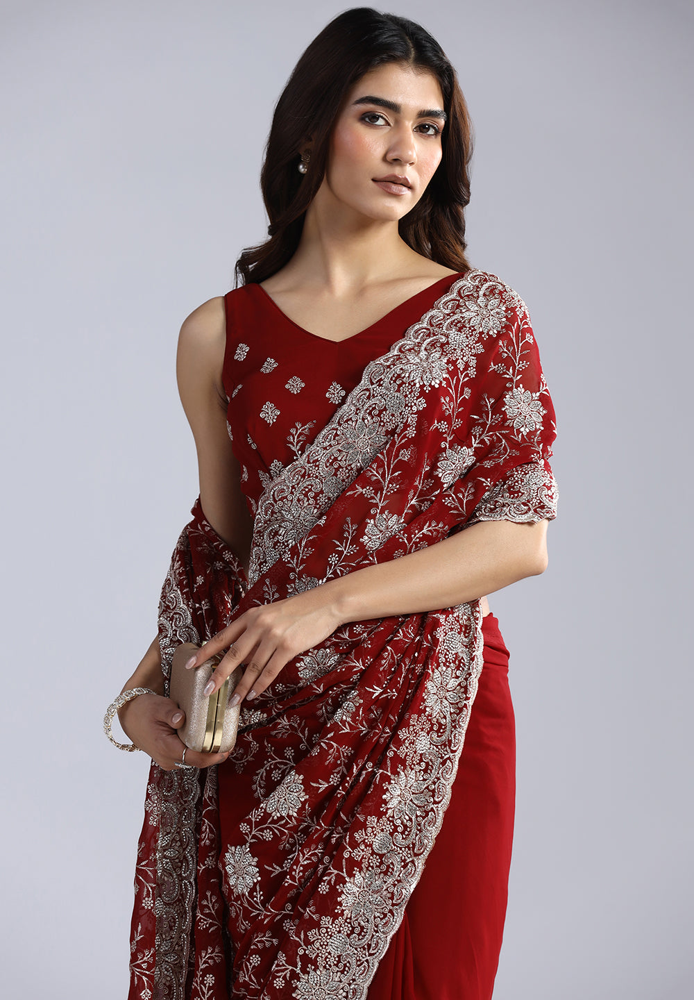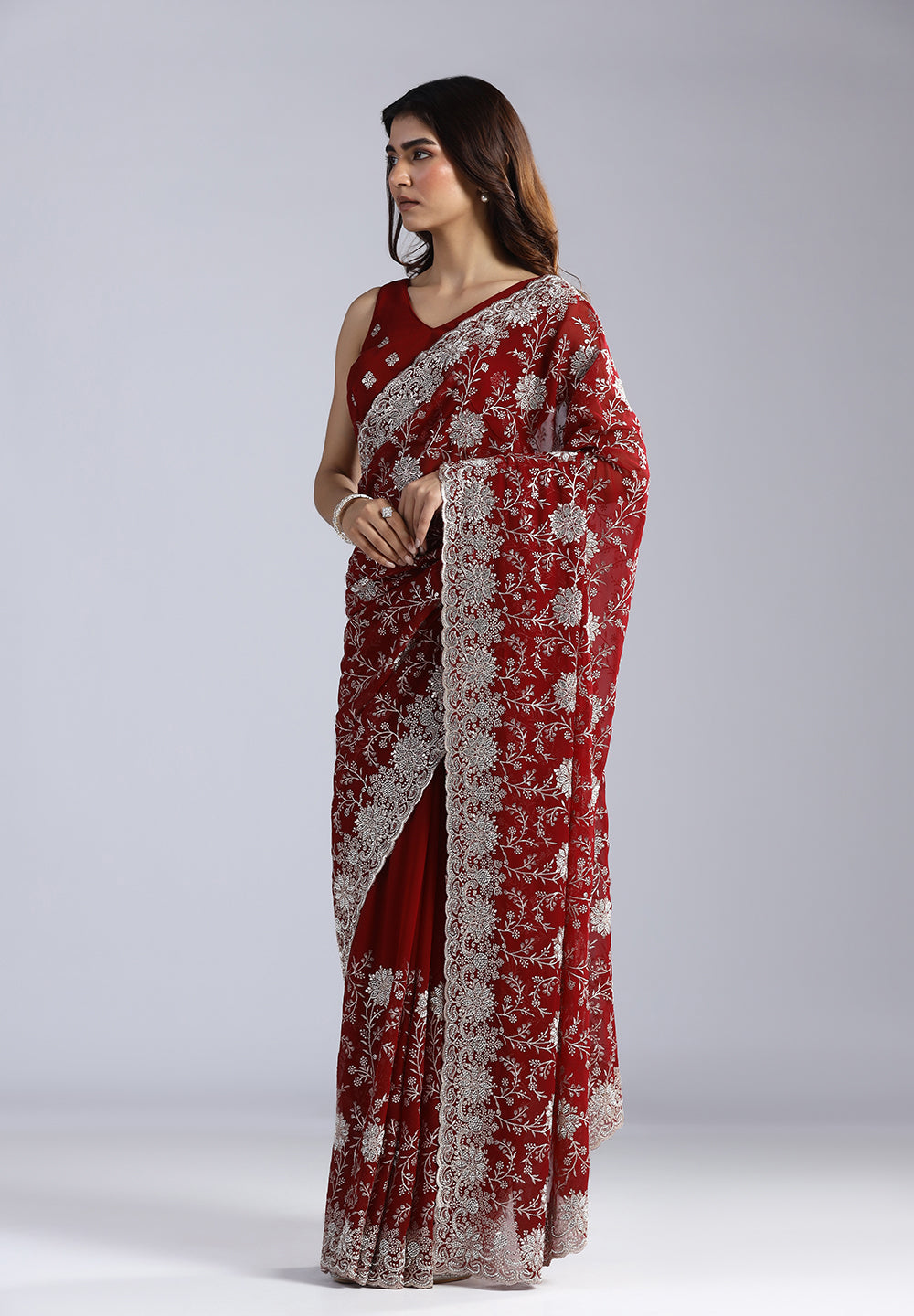 Elevate your evening wardrobe with this breathtaking Georgette Saree, a perfect blend of deep, royal tones and brilliant silver craftsmanship. The lightweight, fluid drape of the georgette fabric makes it an exceptionally comfortable yet glamorous choice for weddings, receptions, and formal festivities