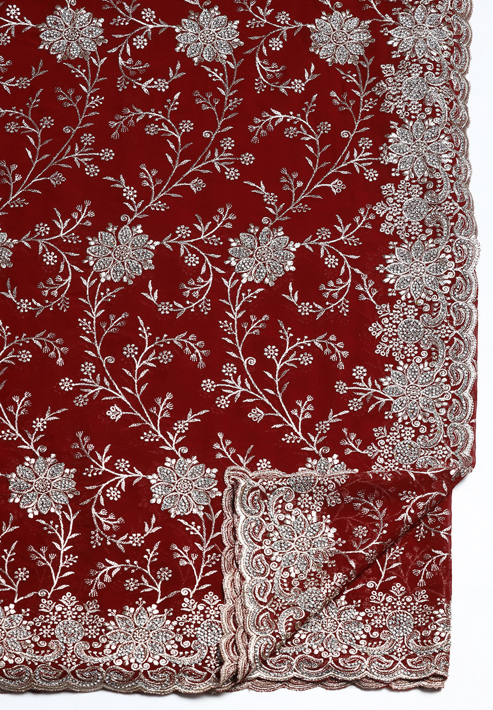 - Signature Scalloped Border: The saree is framed by a heavy, ornate border featuring scalloped edges and dense needlework