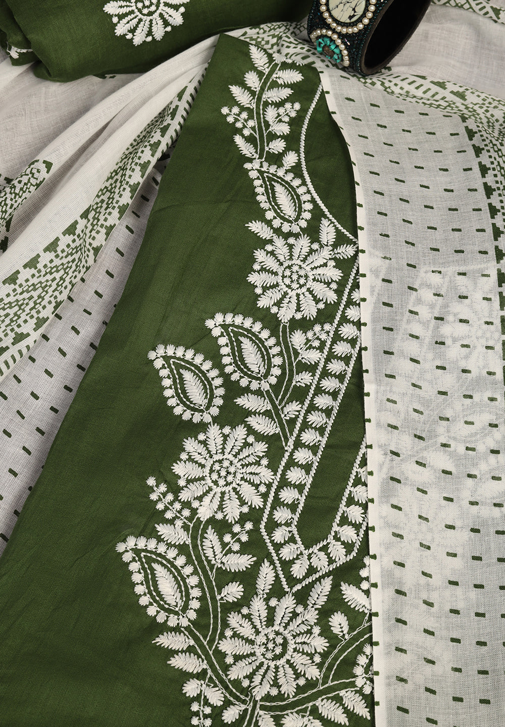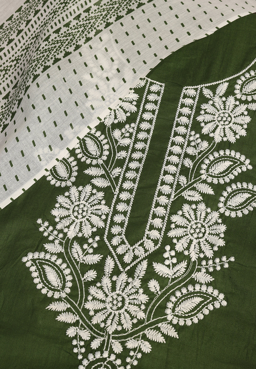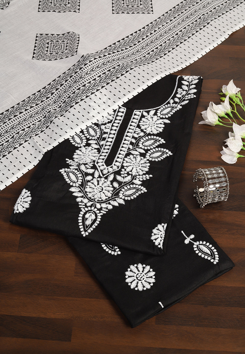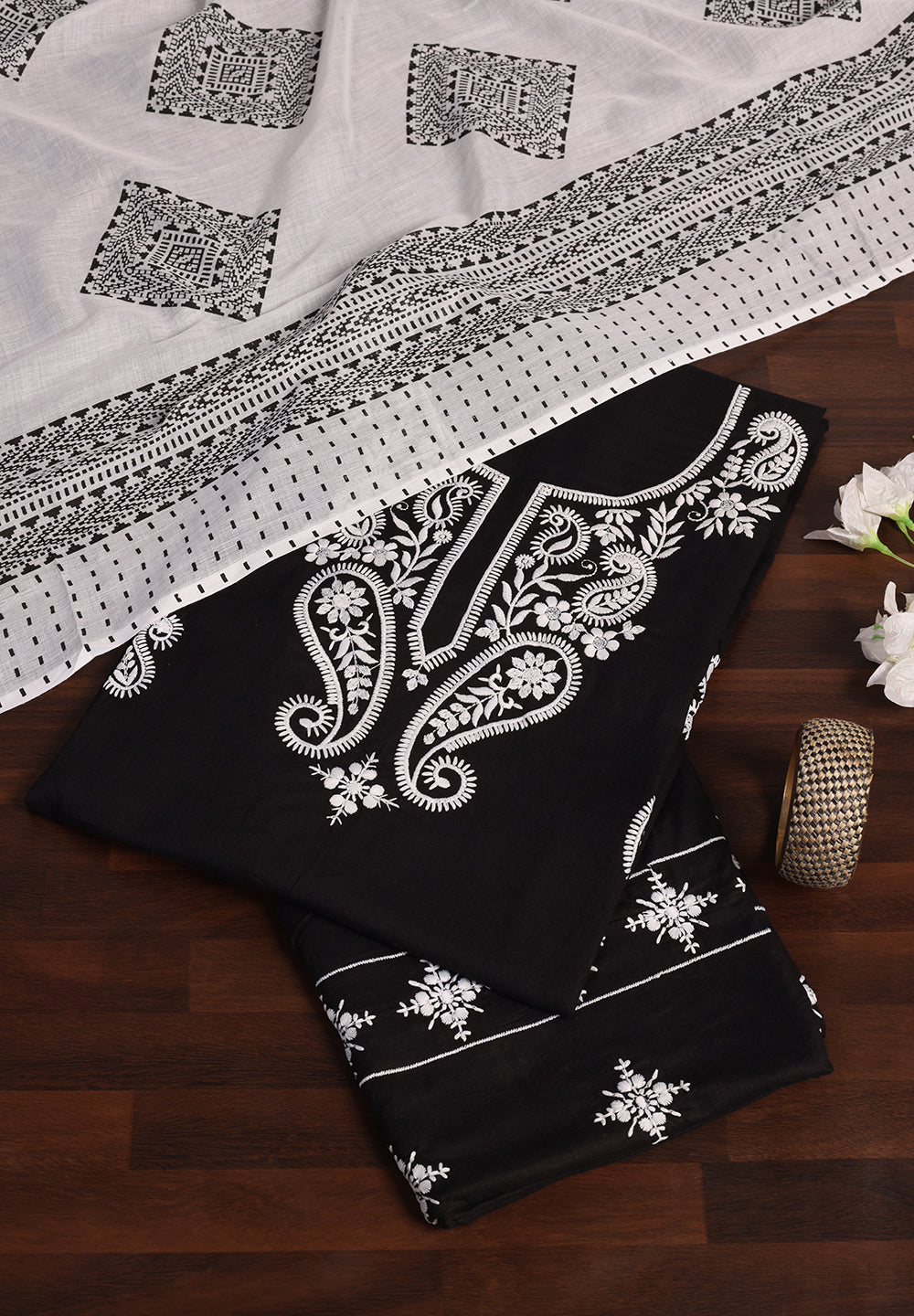Elevate your style with our Cotton Suit Set. The unstitched fabric is adorned with exquisite Thread Work. Paired with an unstitched Cotton bottom and a Cotton Printed Dupatta, the ensemble is designed to bring together the beauty of craftsmanship and elegance.