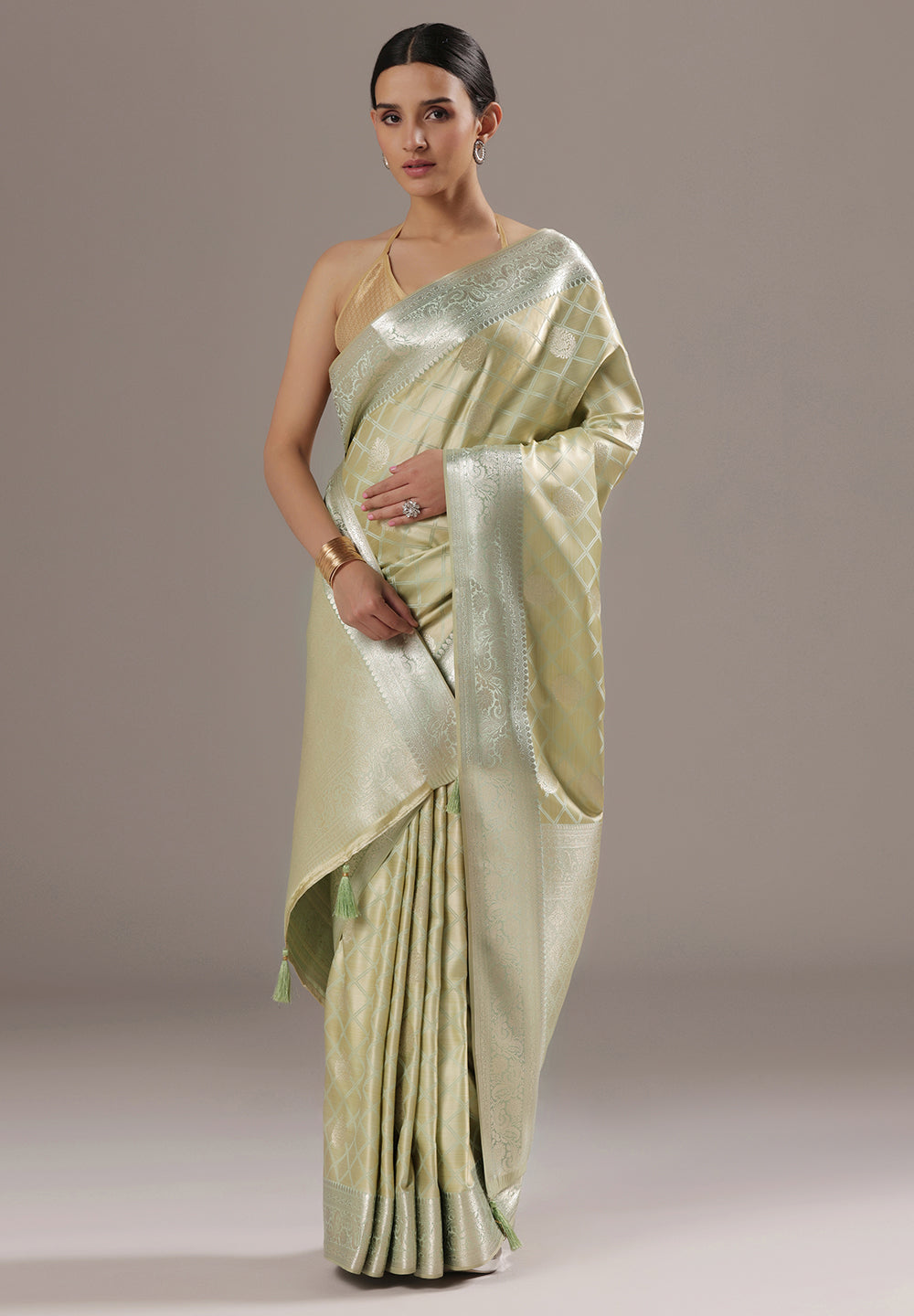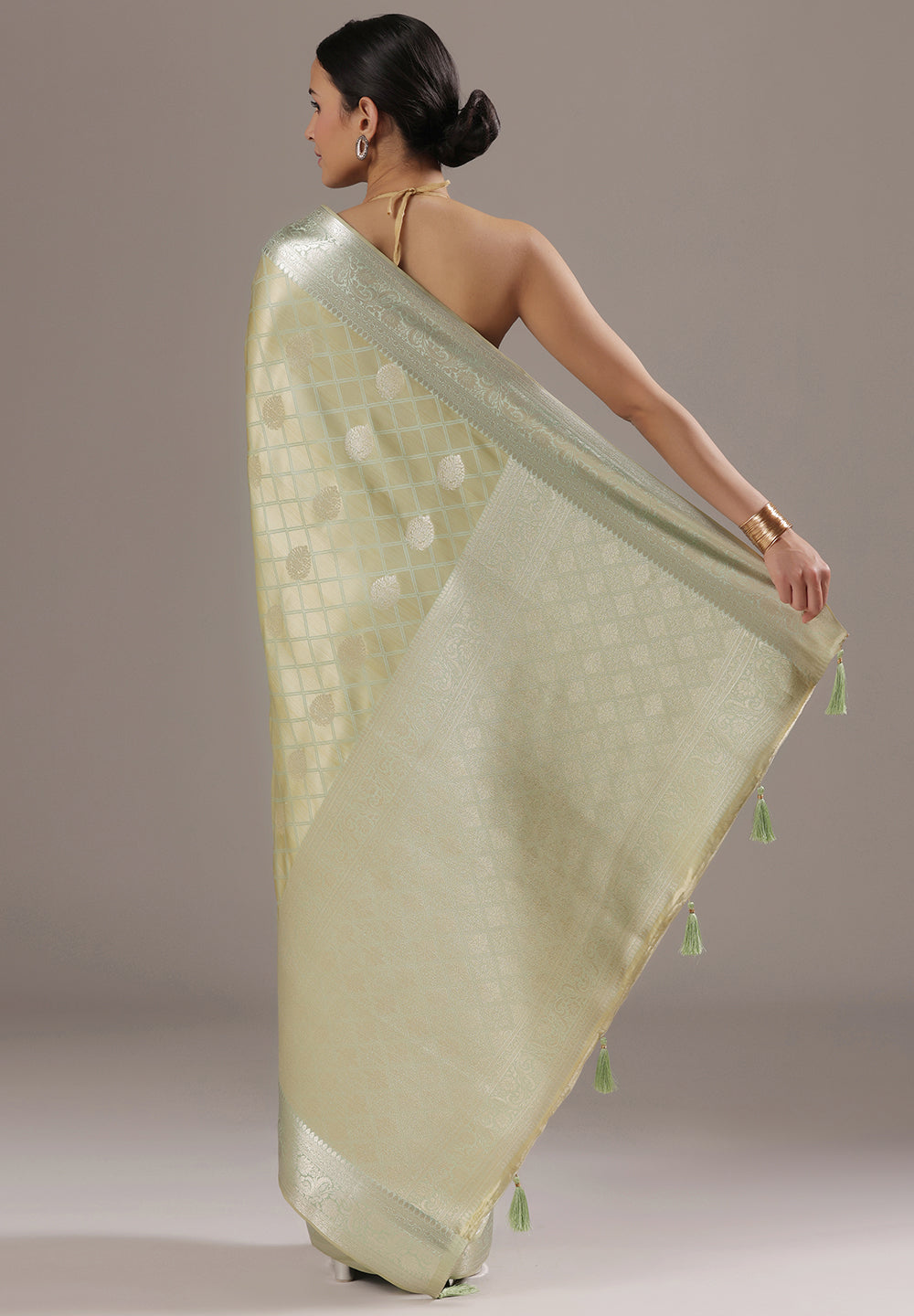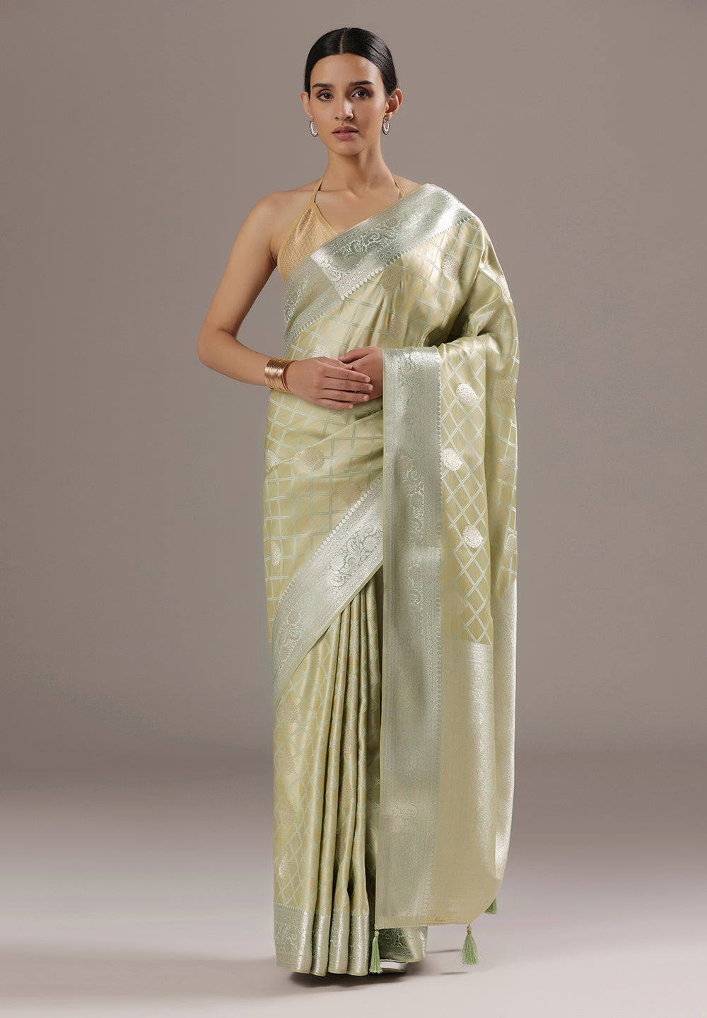 - The Saree is Elevated With All Over Zari