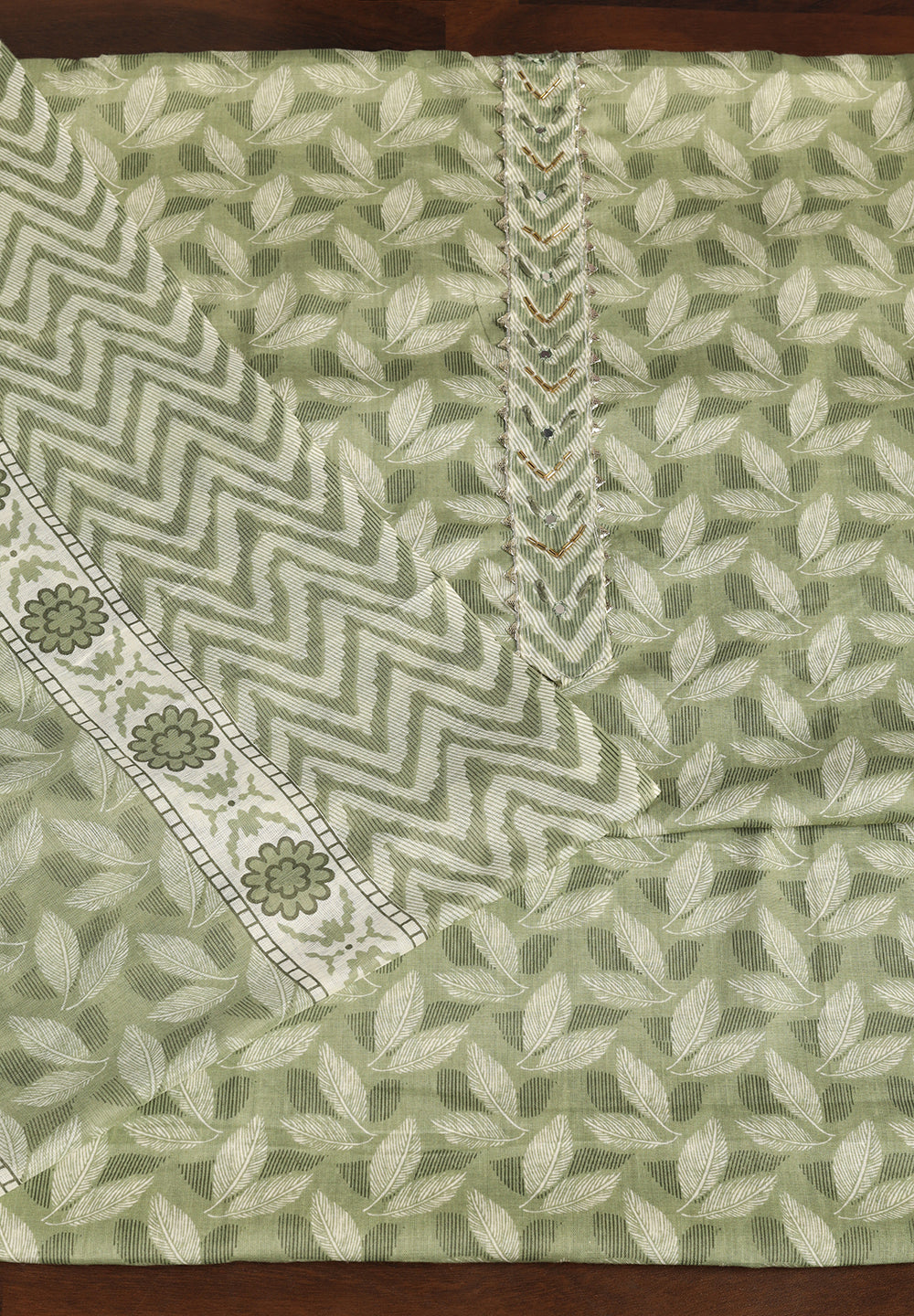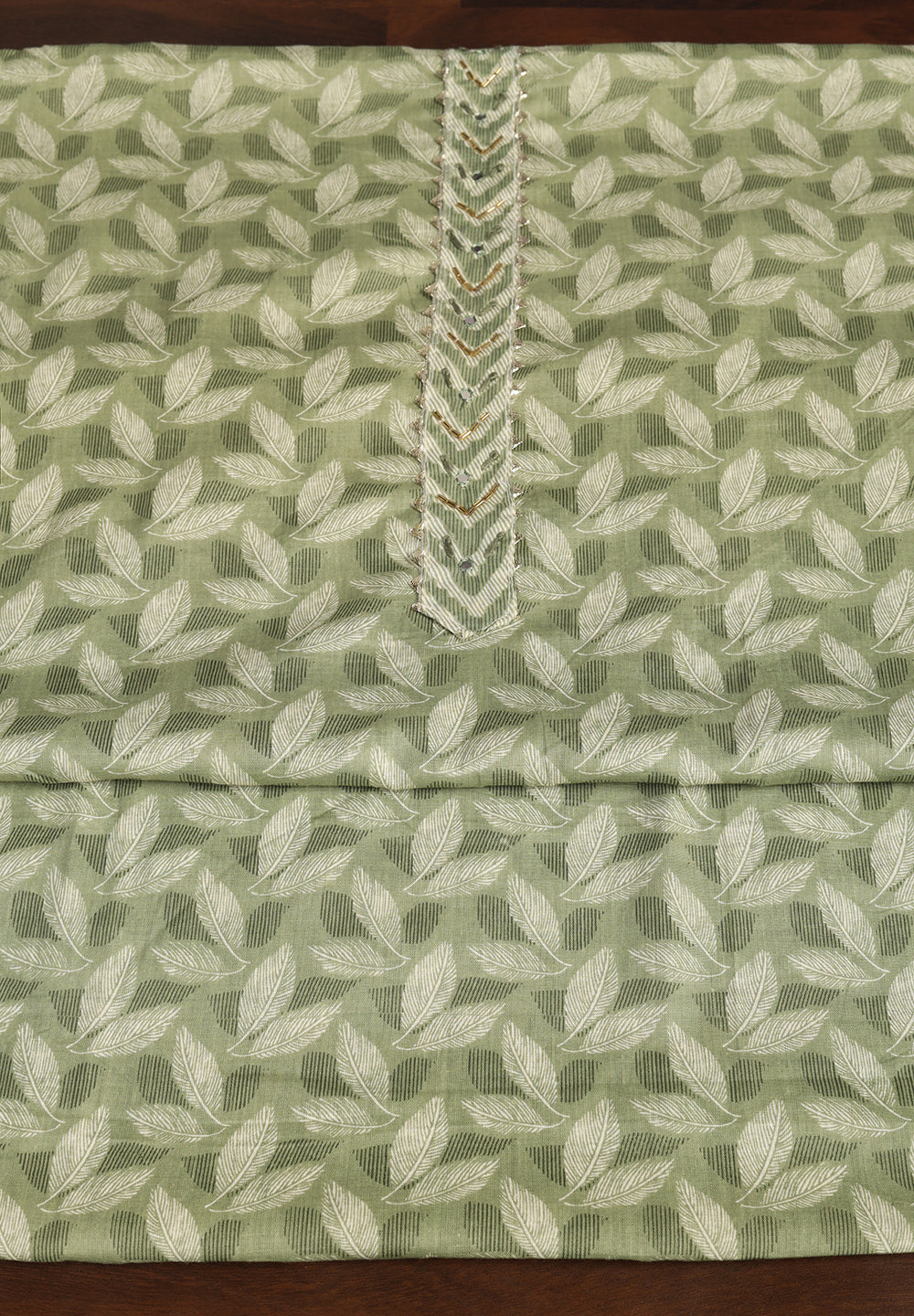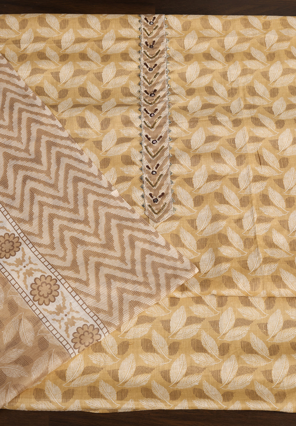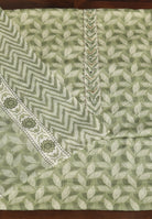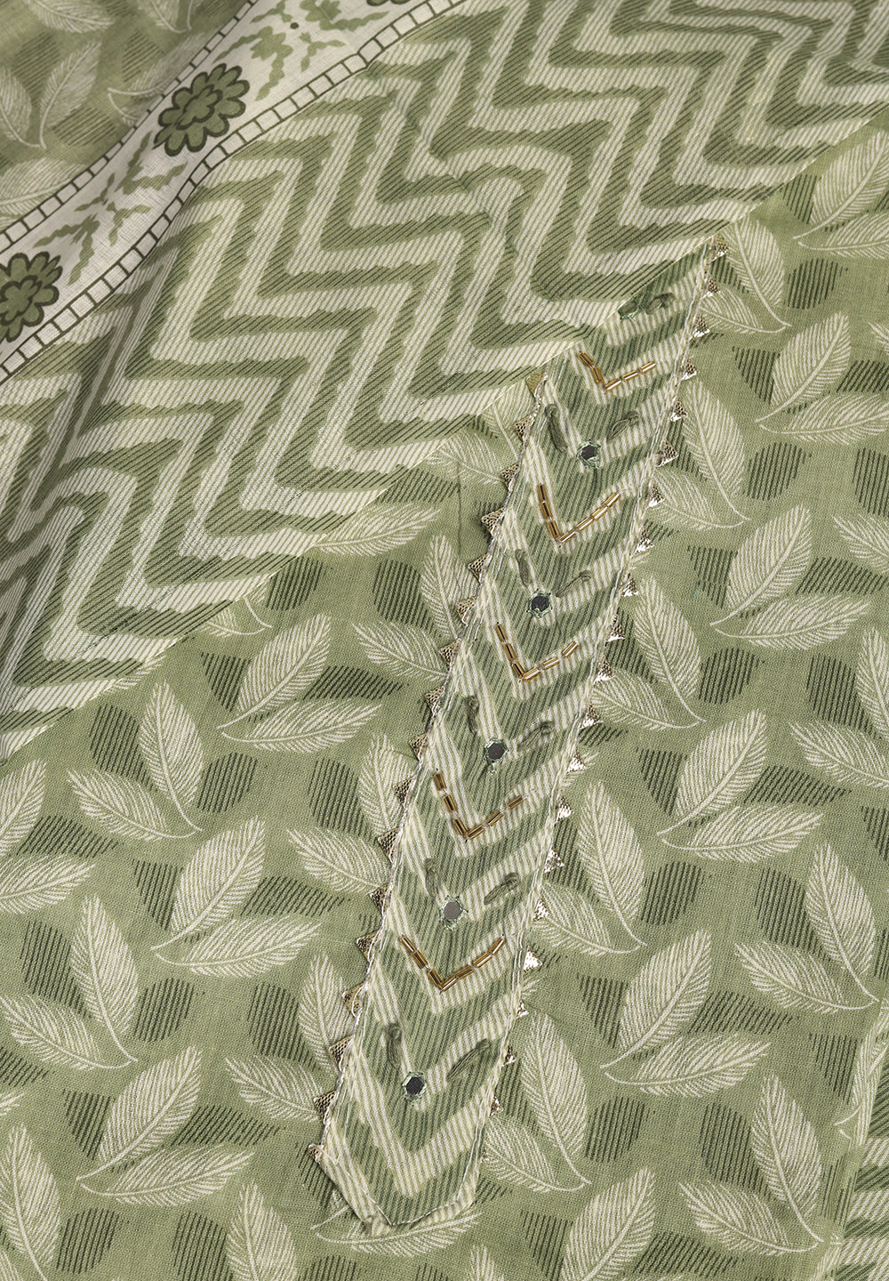 "Leaf Print Cotton Suit – Unstitched Grace with Neck Patch Detail"