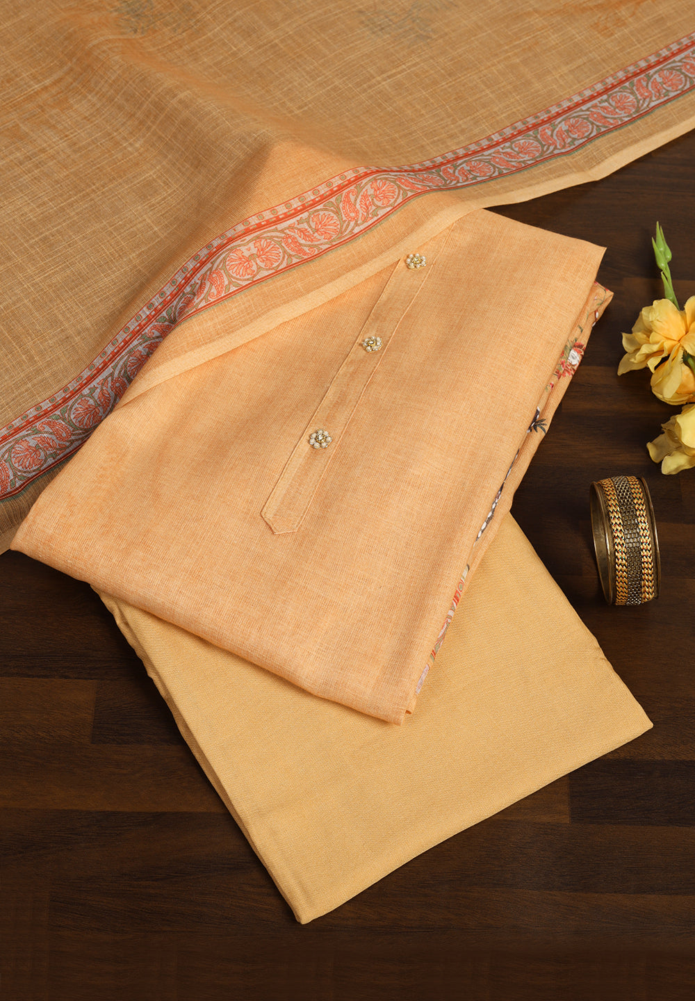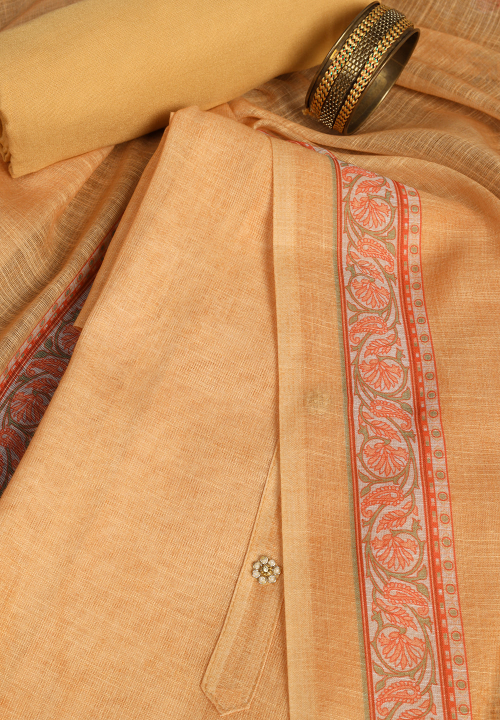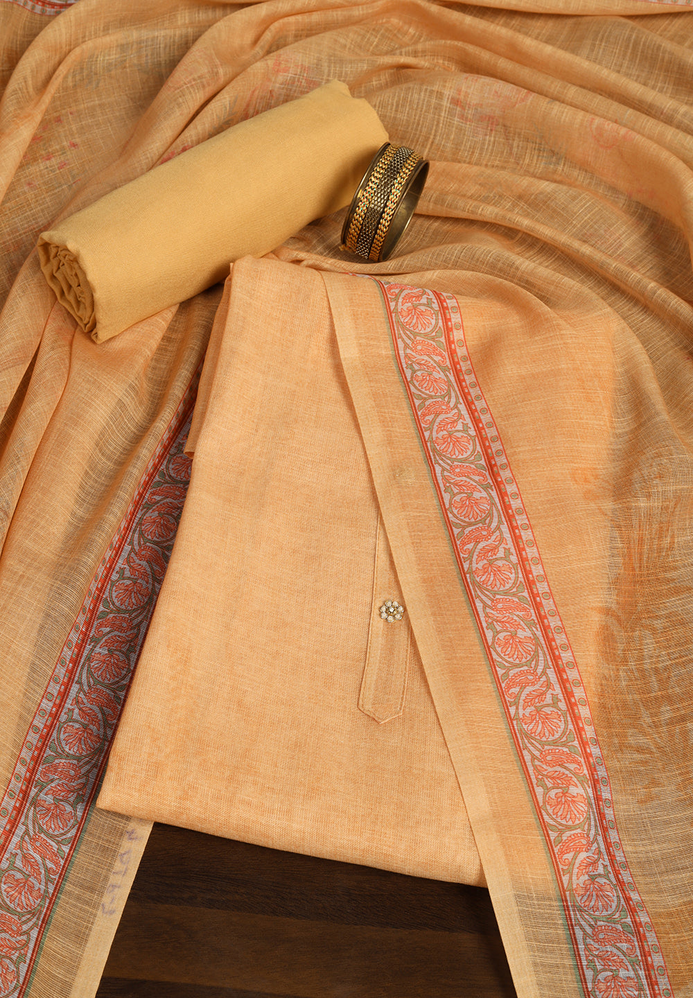 Elevate your style with our Linen Cotton Suit Set. The unstitched fabric is adorned with exquisite Printed Thread work. Paired with an unstitched Cotton bottom and a Linen Cotton Dupatta, the ensemble is designed to bring together the beauty of craftsmanship and elegance.