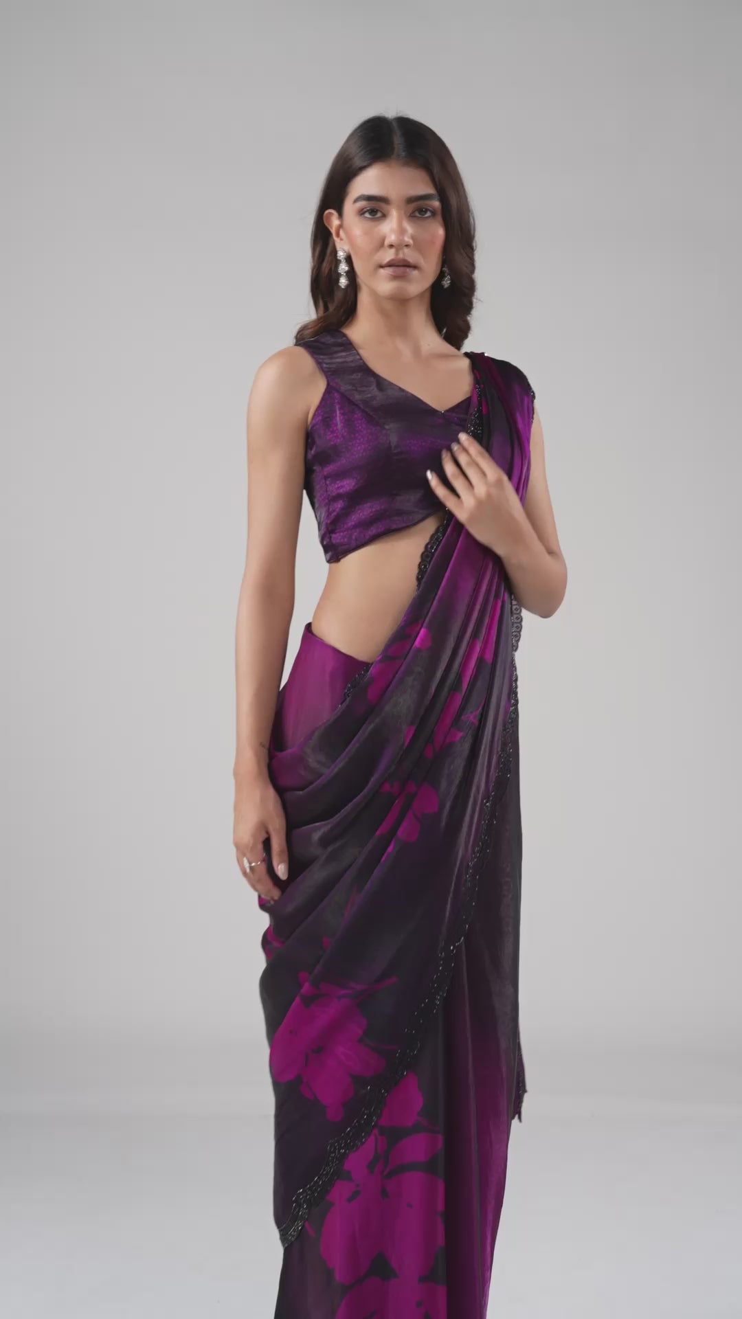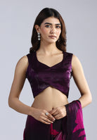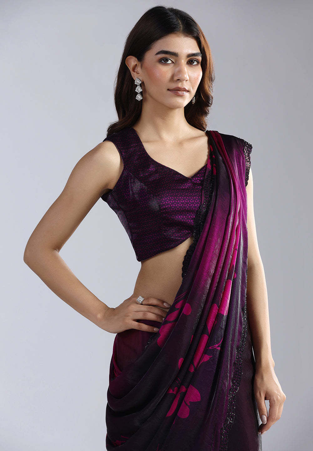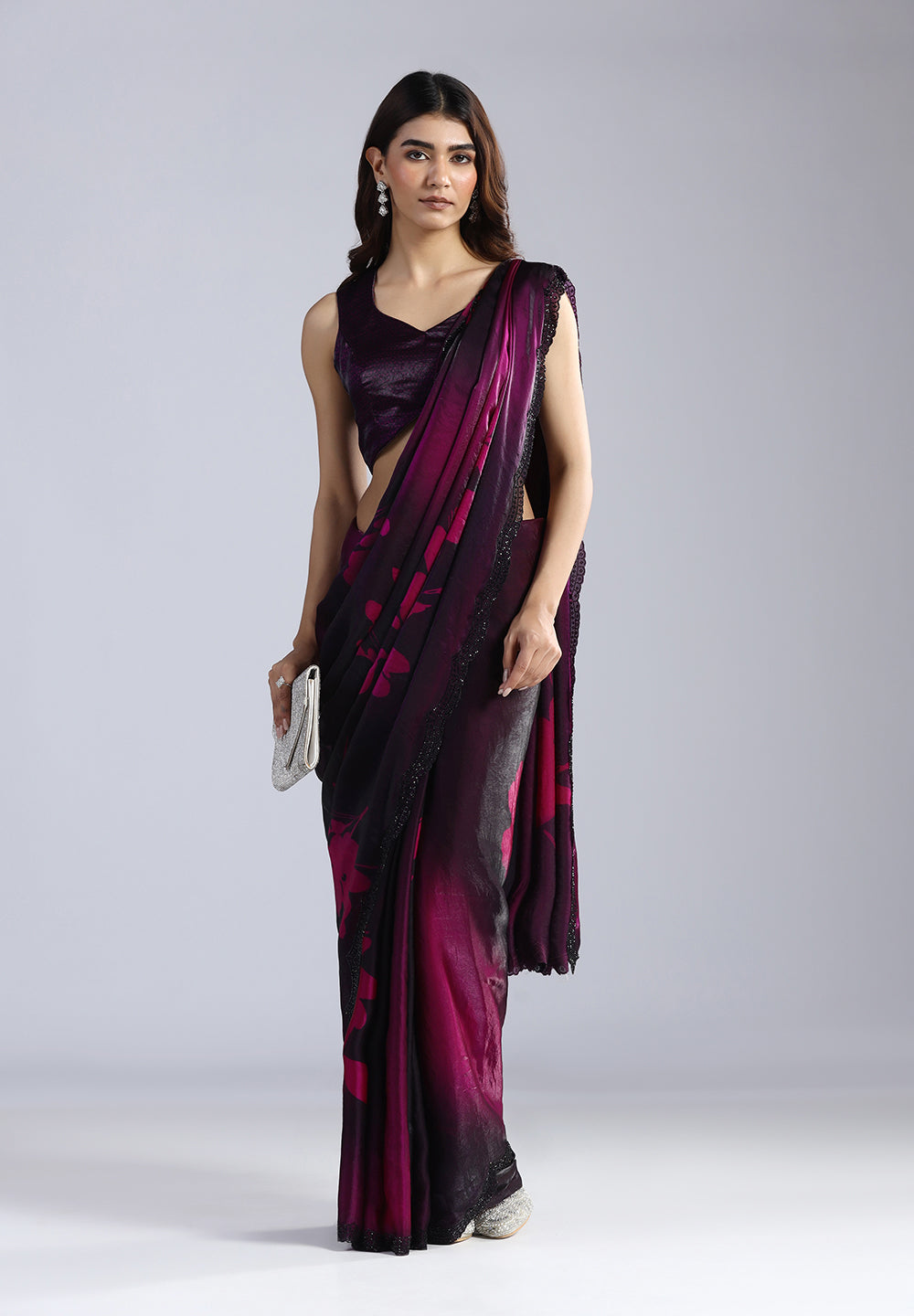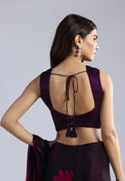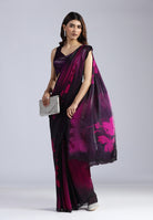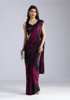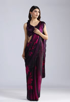 Swarovski Work: The saree is meticulously adorned with black Swarovski stones that catch the light subtly, adding a touch of luxury without overpowering the print