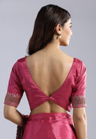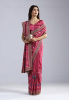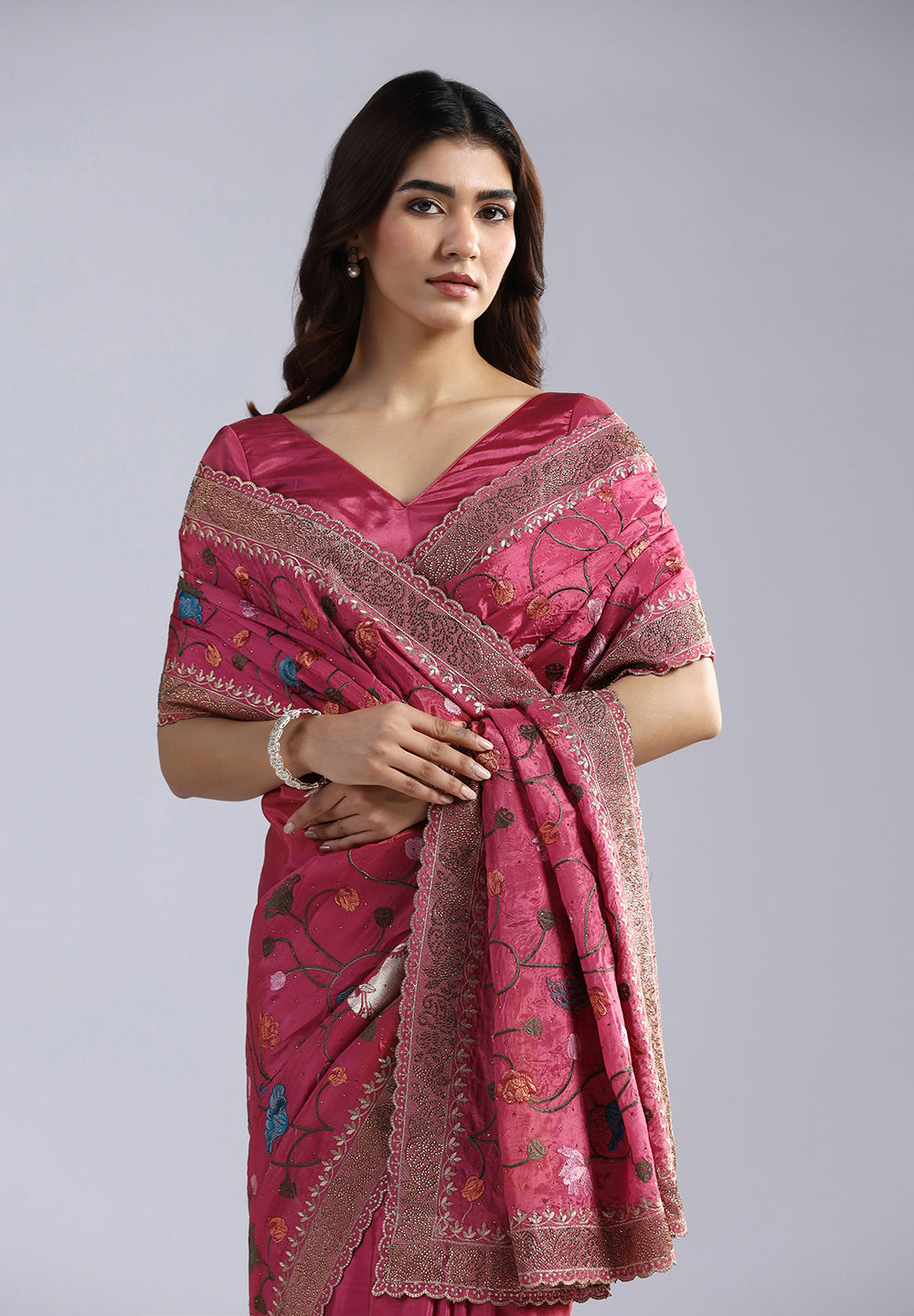 - The saree is delicately peppered with authentic Swarovski-style stones