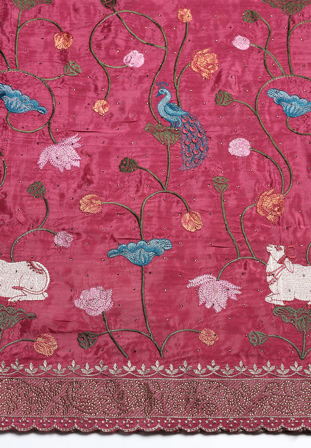- The borders and outlines of the motifs are defined by fine Gold Zari work