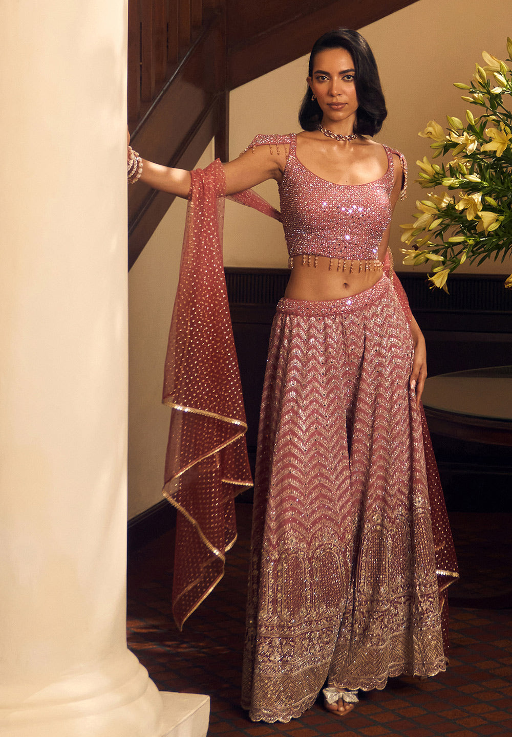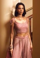 Elevate your grace with our 'Pink Elegance' Georgette Sharara Set adorned with Mirror work. Accompanied by a matching bottom and Choli, this ensemble is a symbol of traditional charm and contemporary allure. Make a timeless and elegant statement at any occasion with this fusion of classic fashion and modern style.