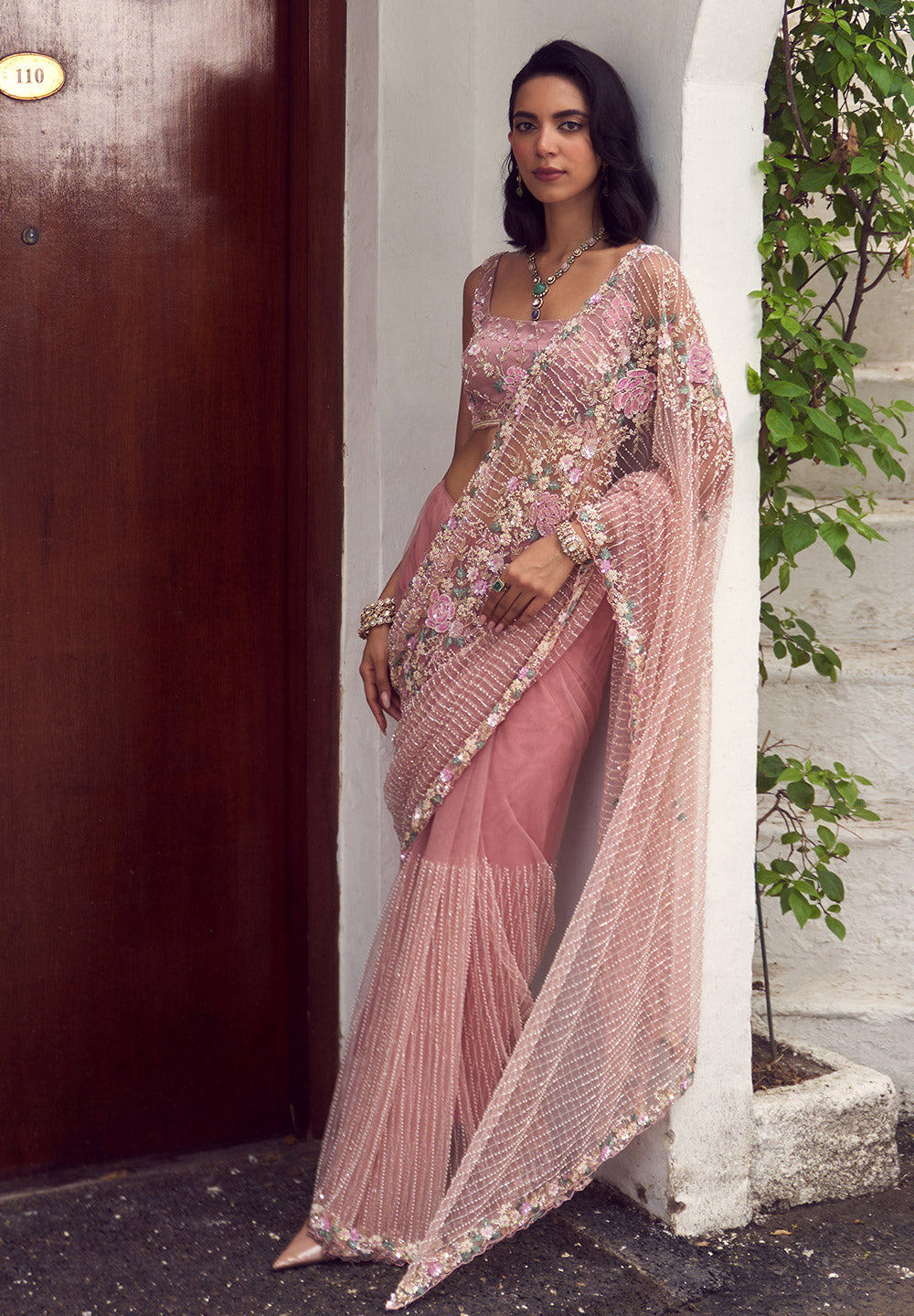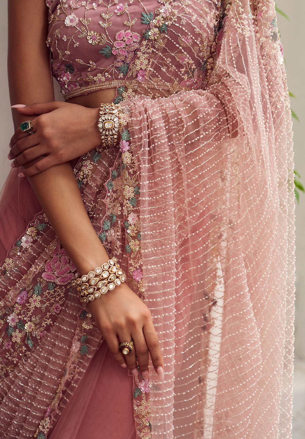 - The Saree is Elevated With All Over Cutdana And Pearls Work
