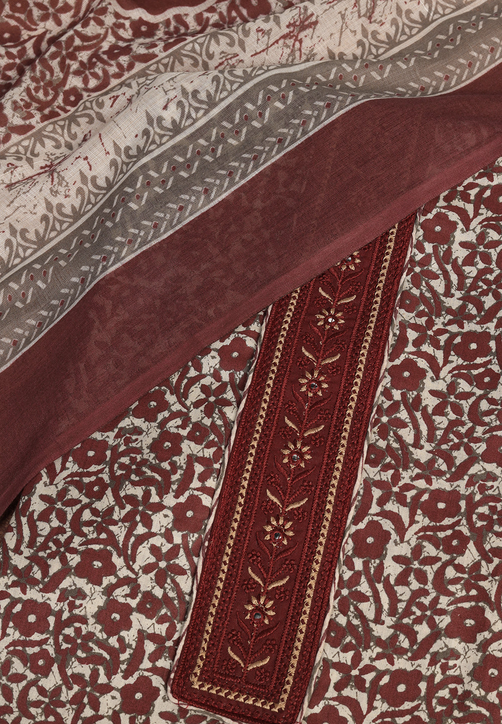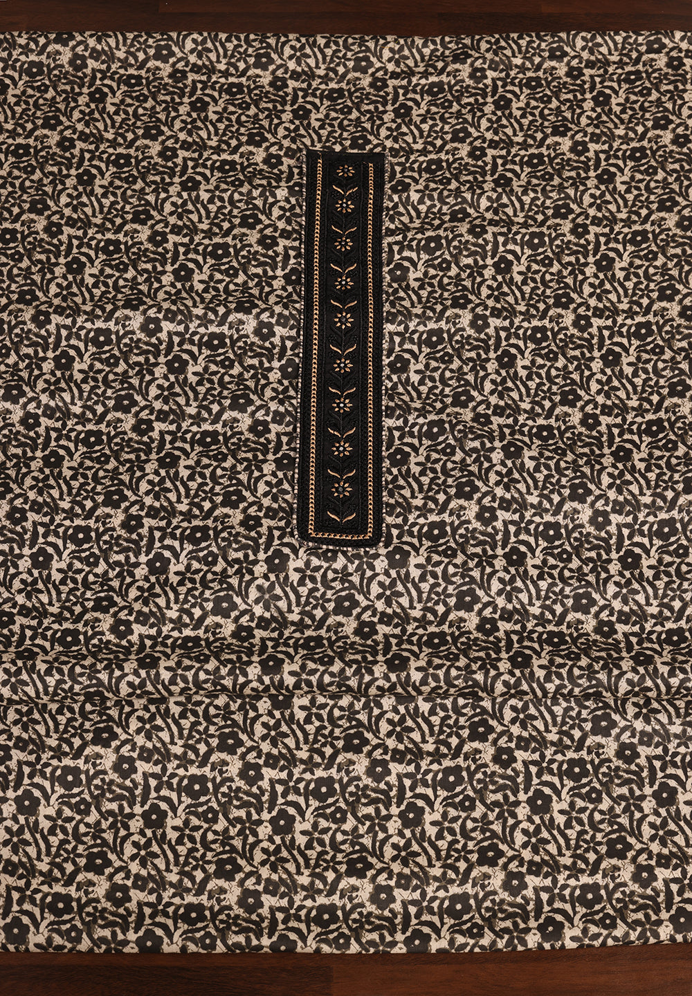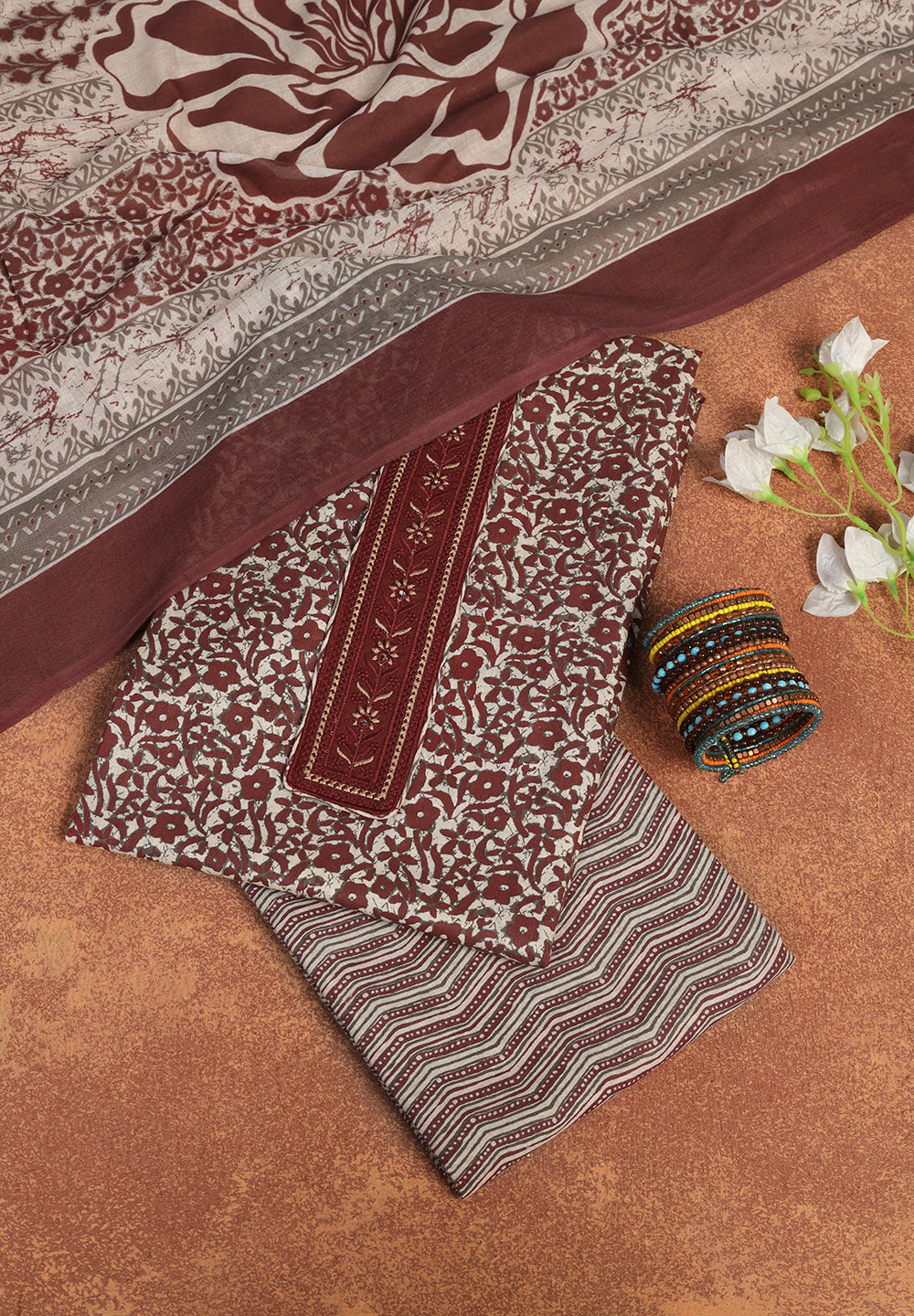 "Printed Cotton Suit with Thread Work Neck Patch – Unstitched & Elegant"