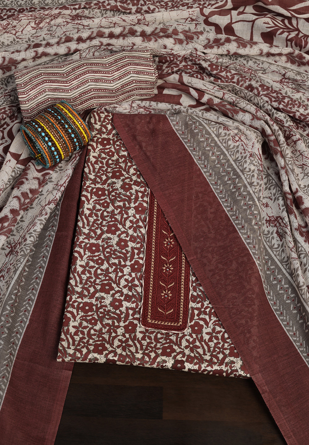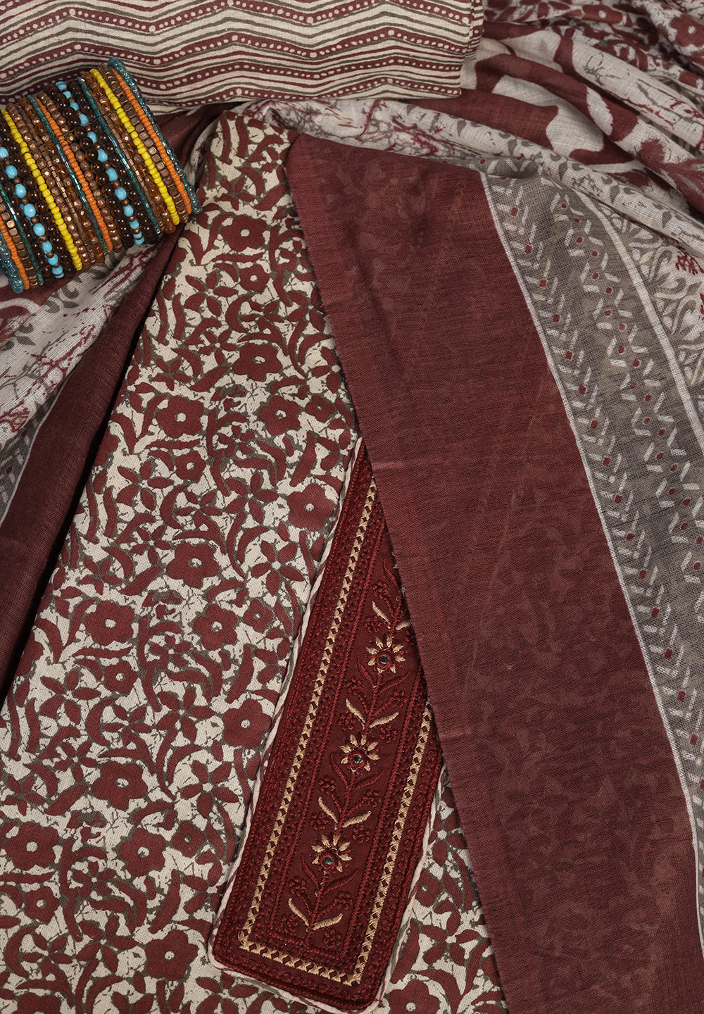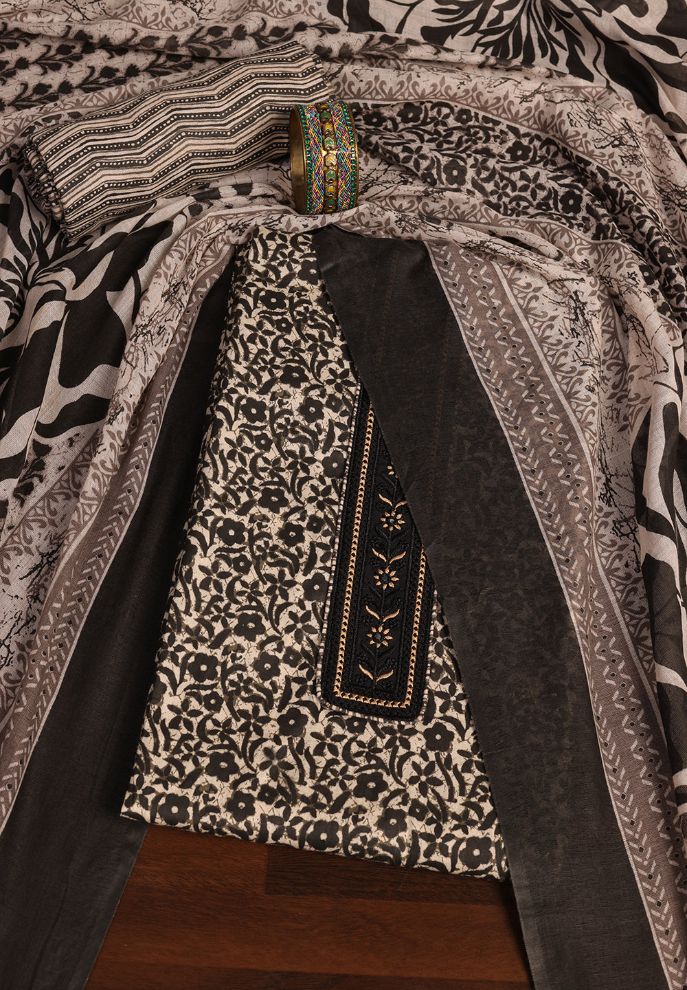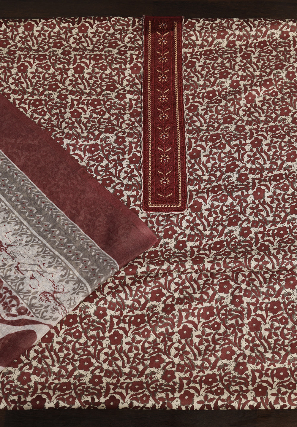 "Printed Cotton Suit with Thread Work Neck Patch – Unstitched & Elegant"