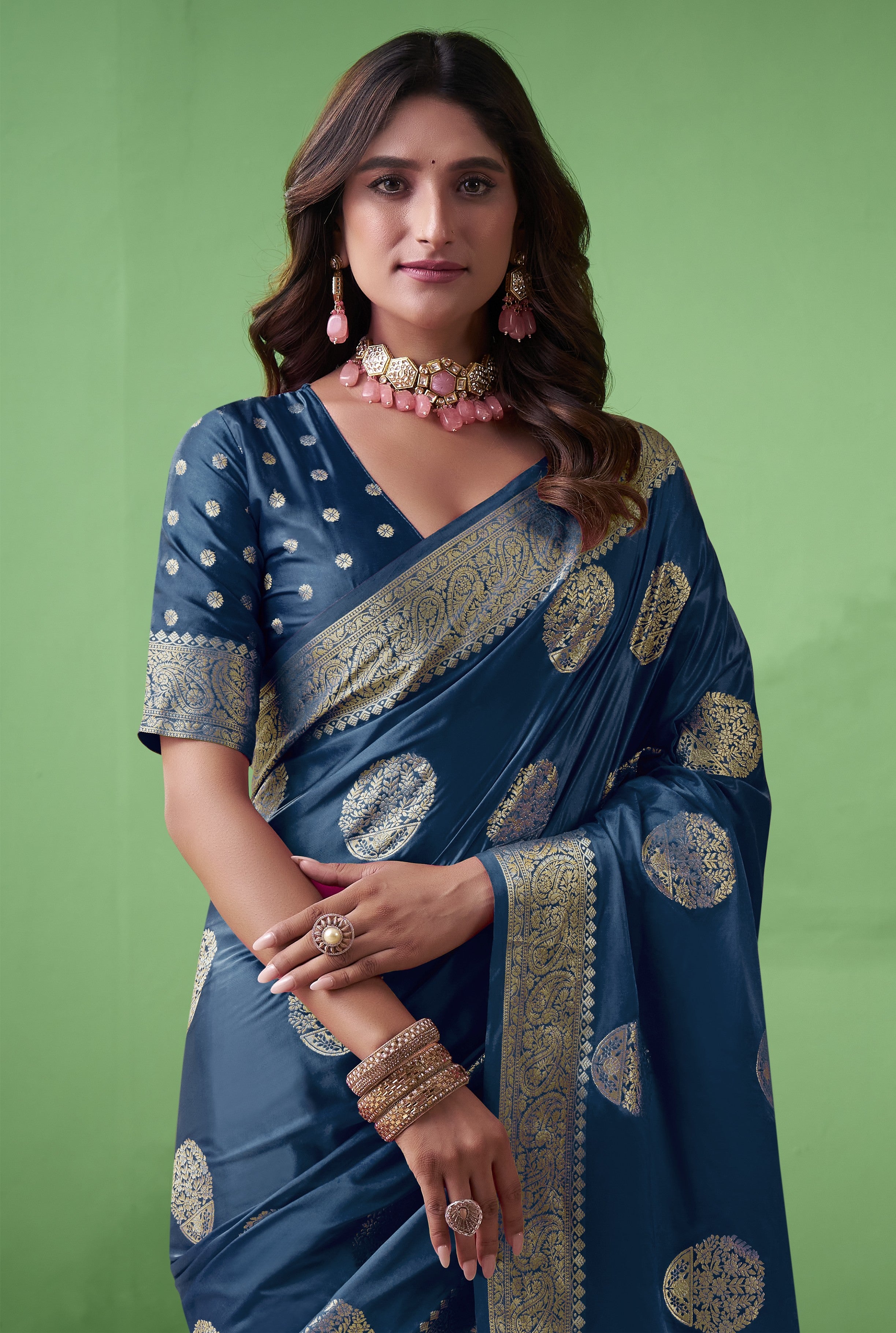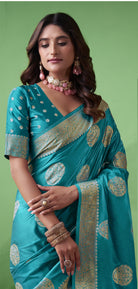 Royal Prussian Banarasi Silk Saree with Intricate Gold Zari Work