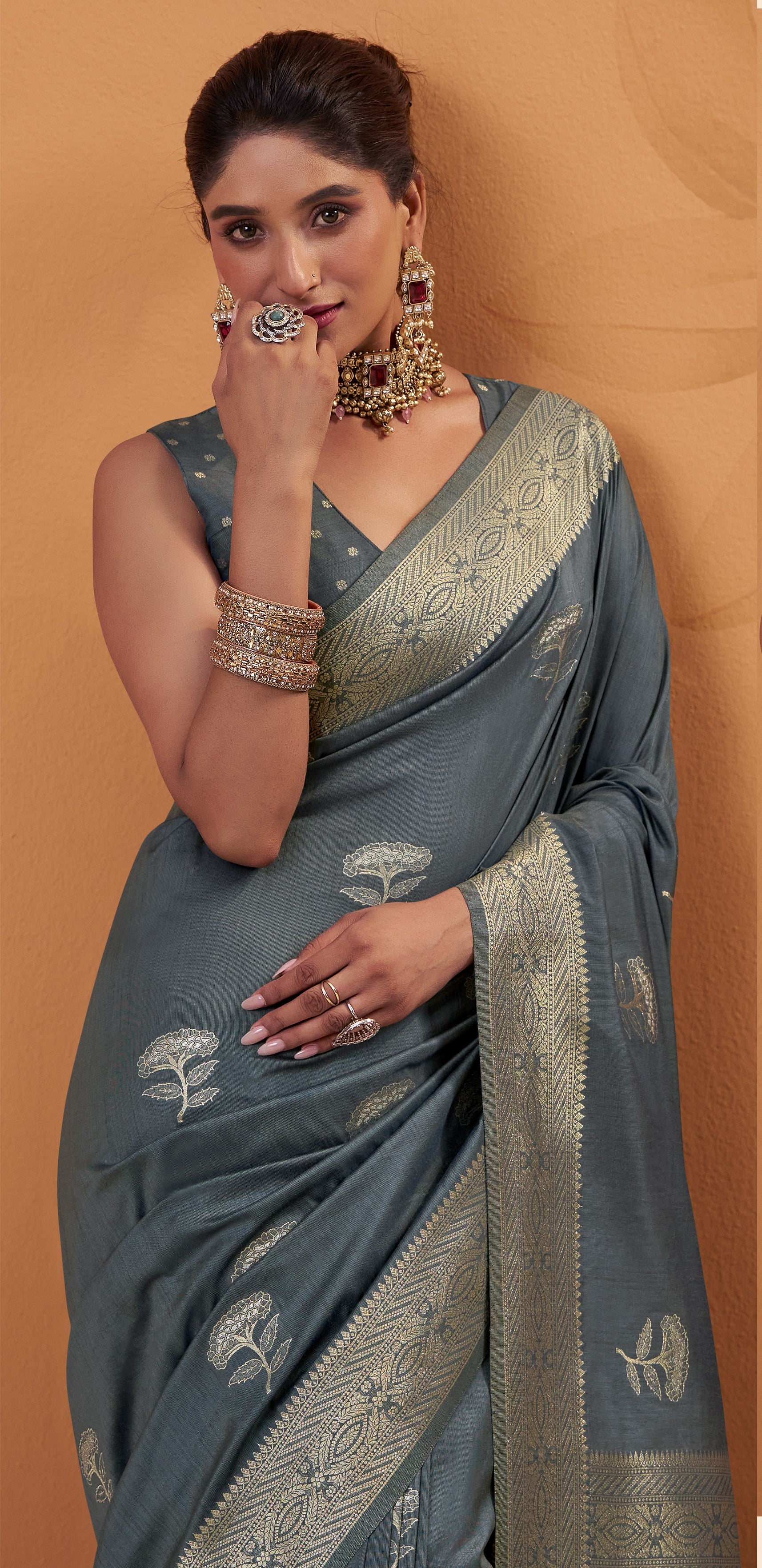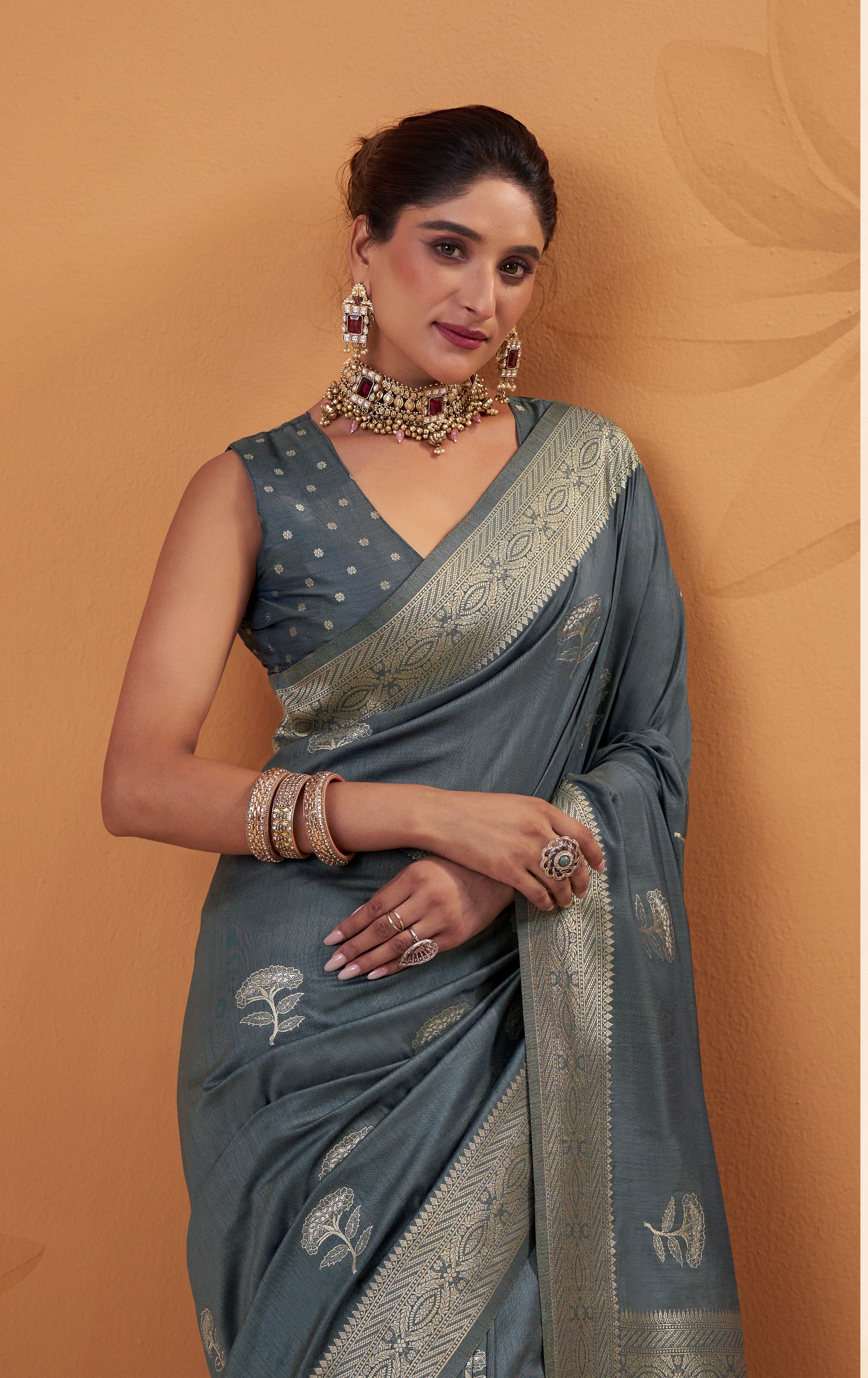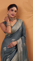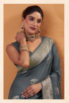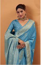 - The Saree is Elevated With All Over Zari