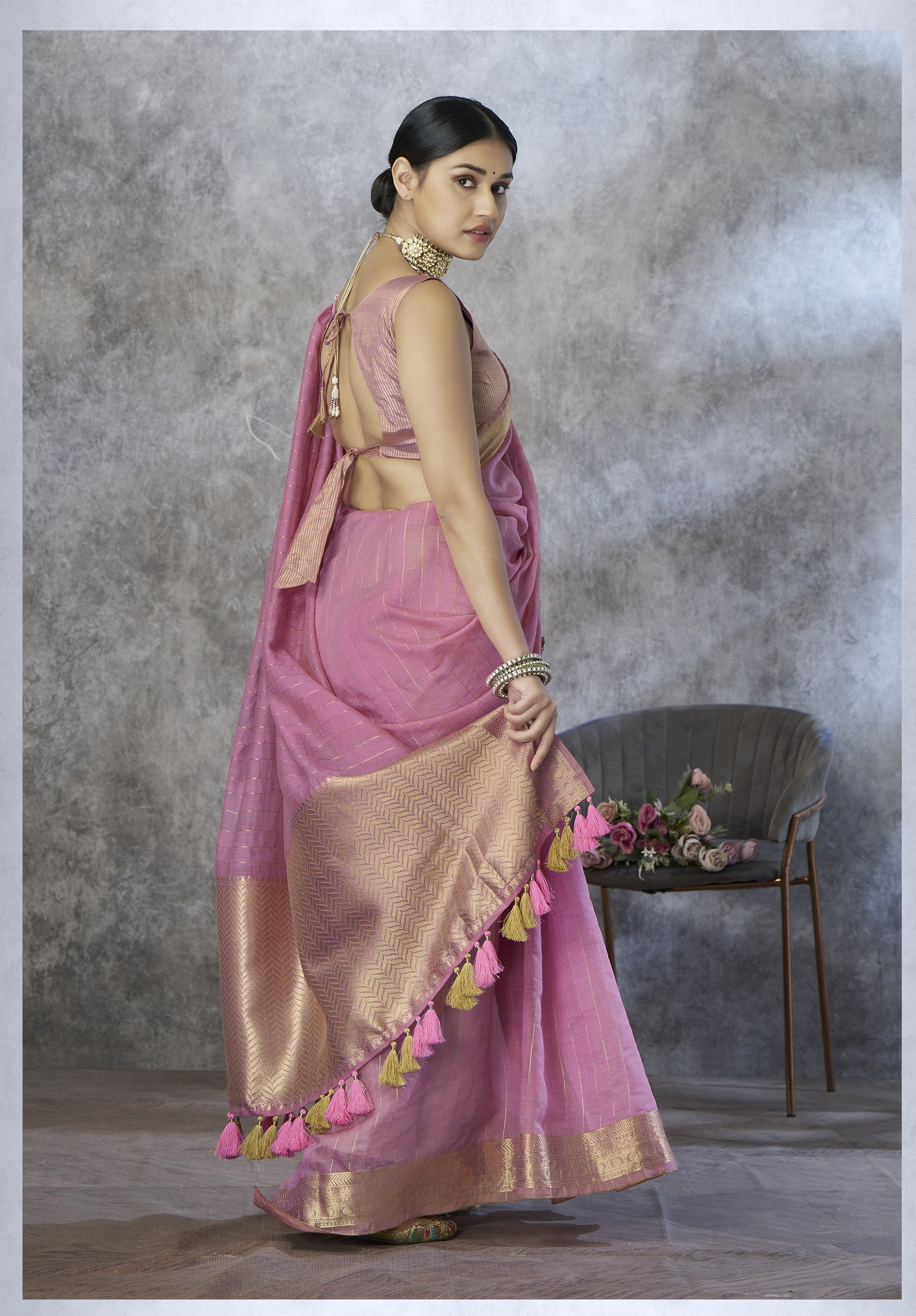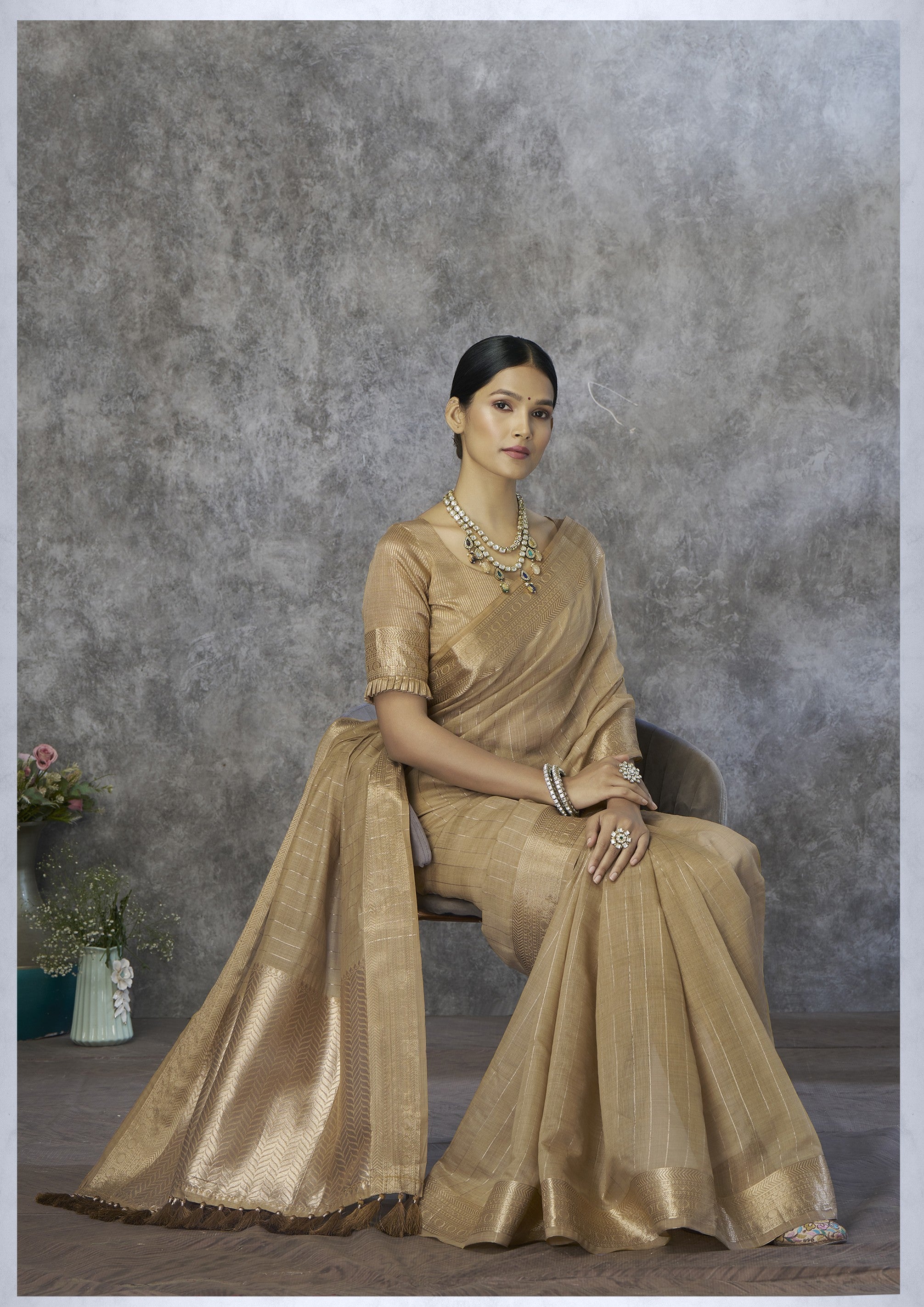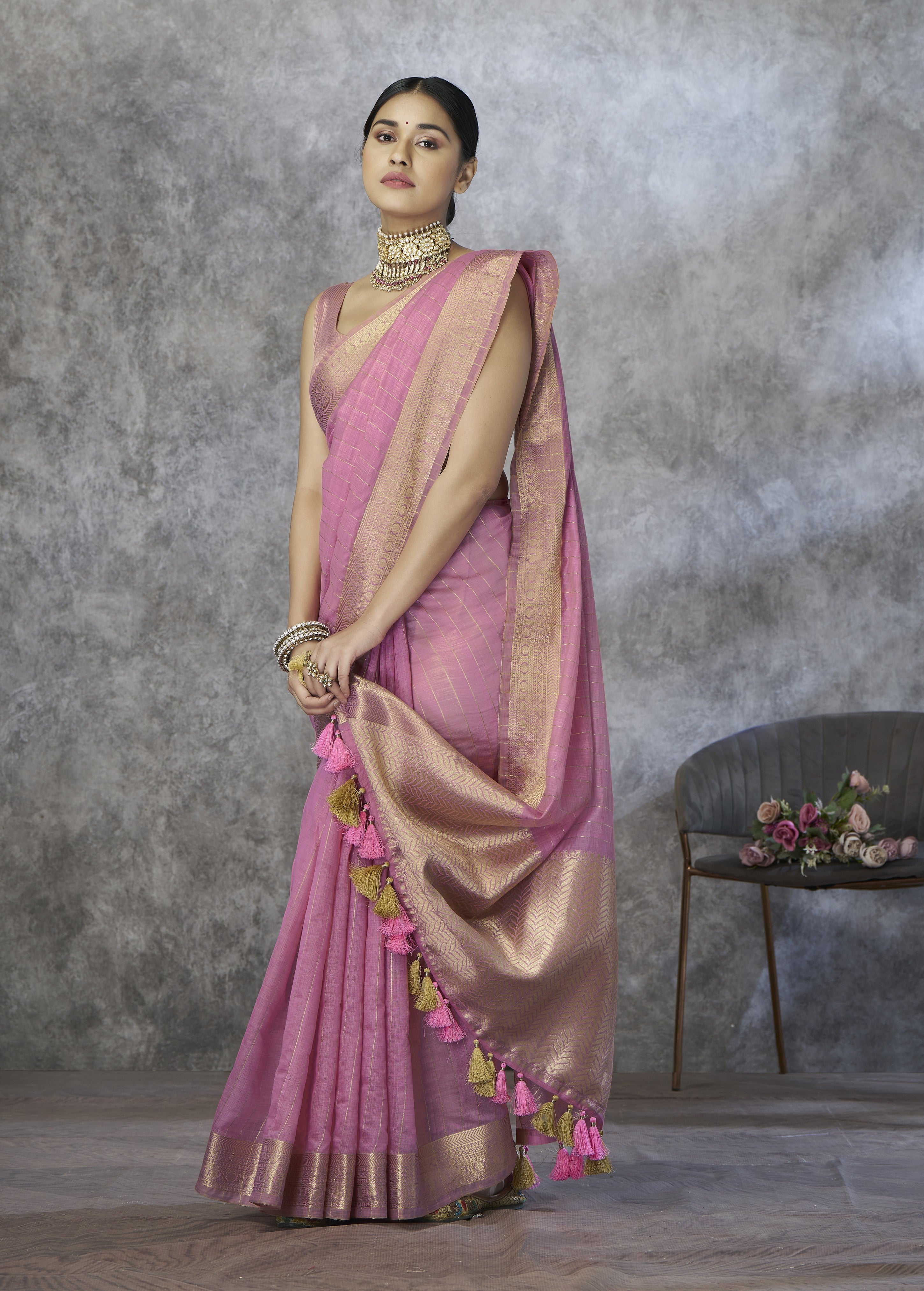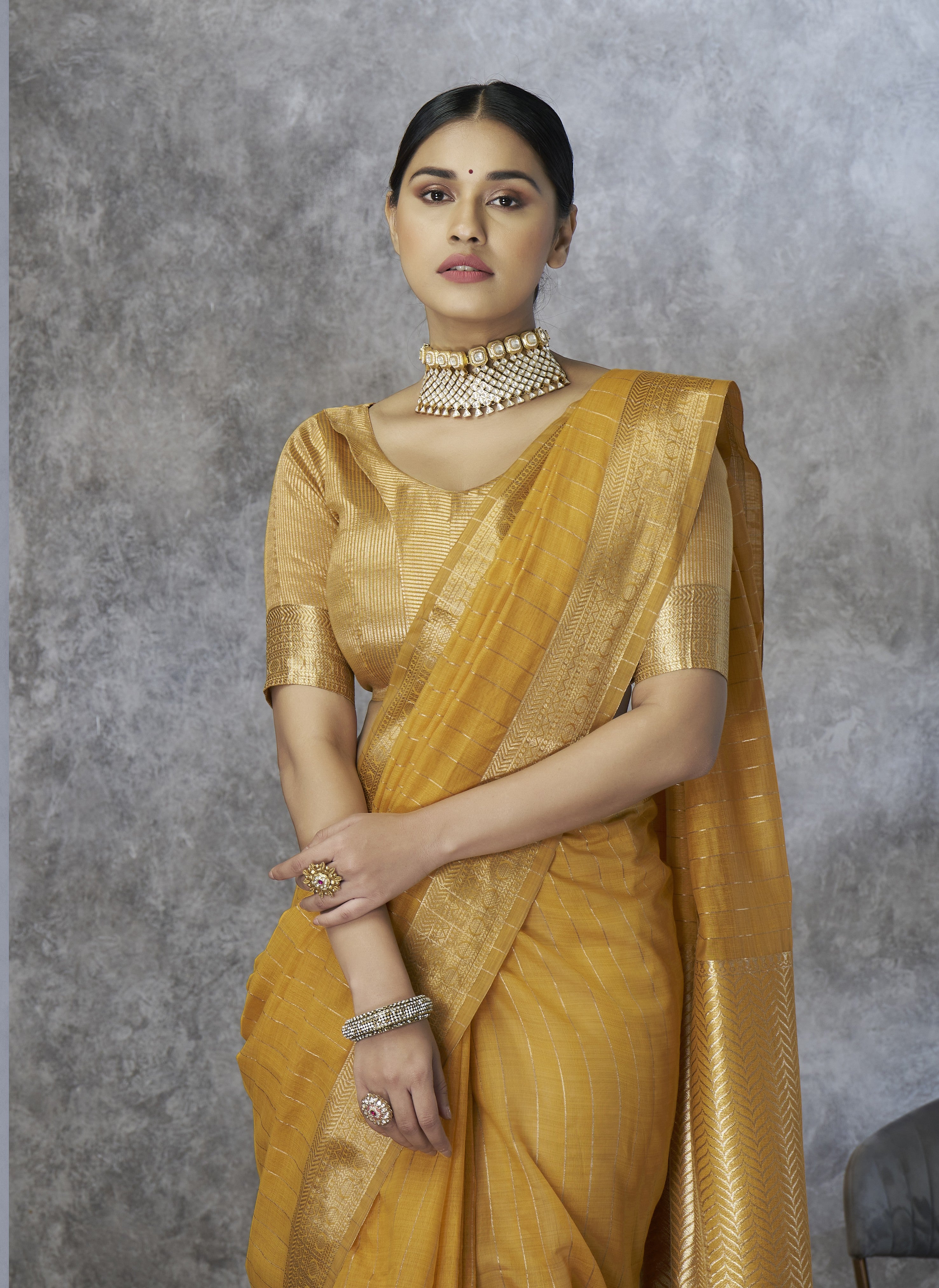 - The Saree is Elevated With All Over Zari