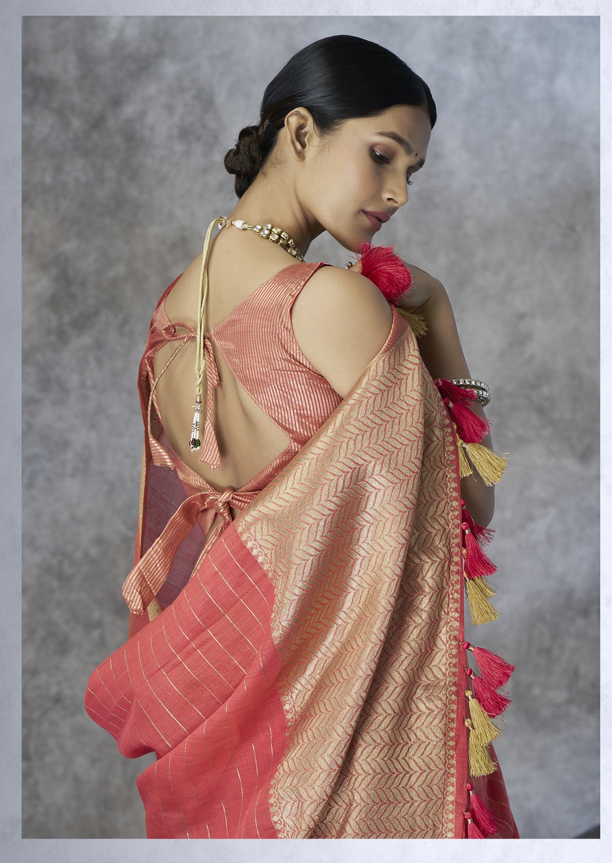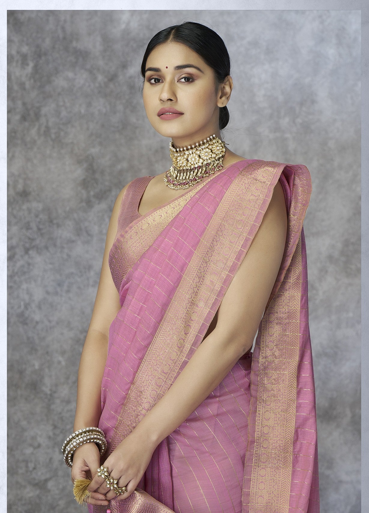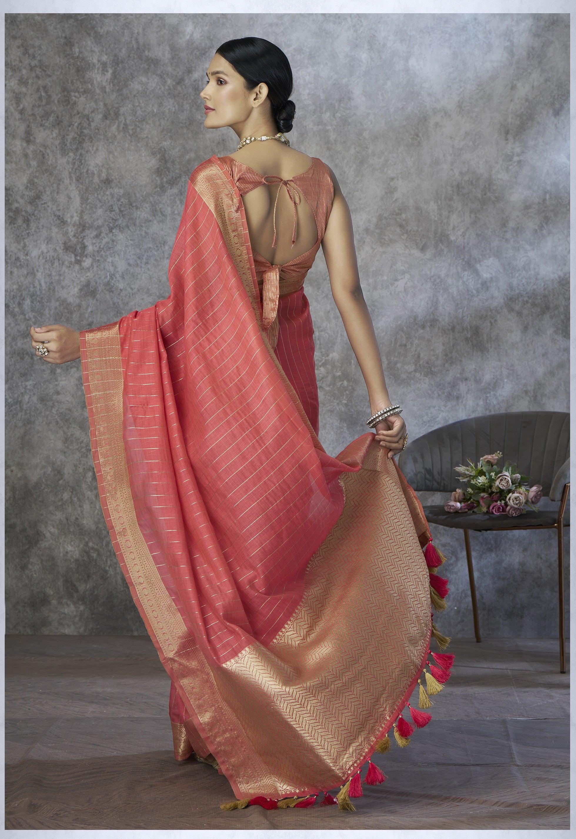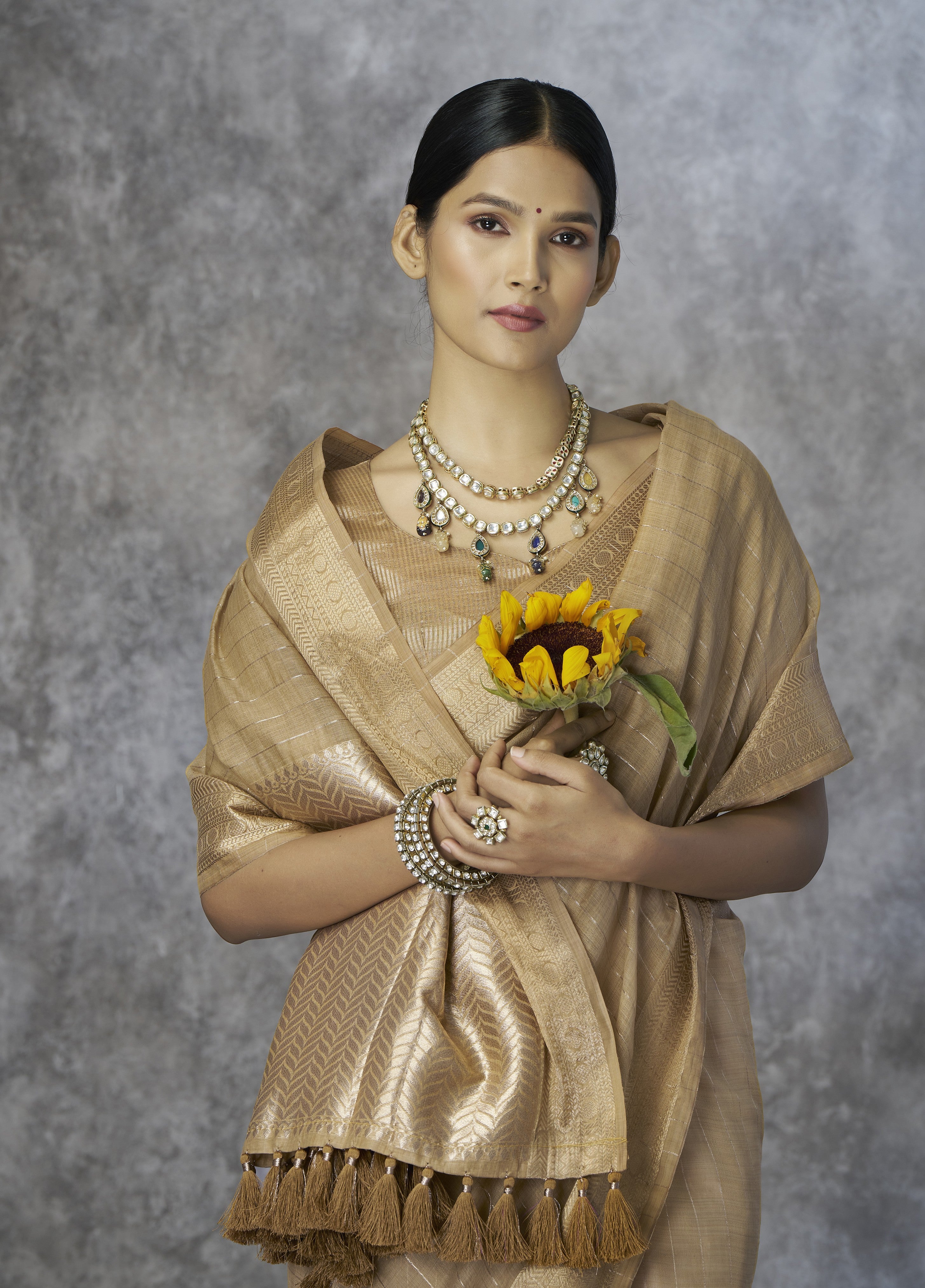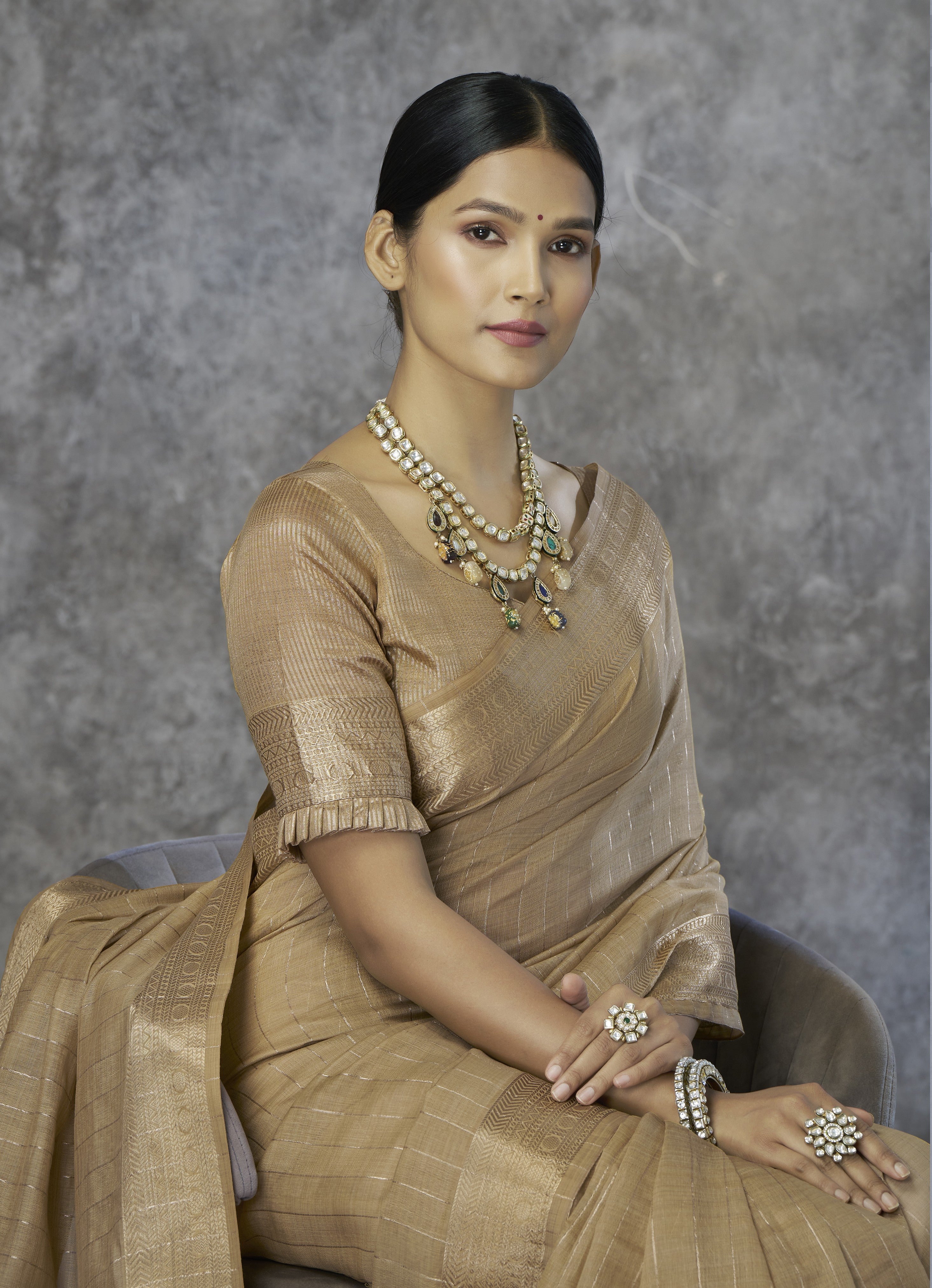 - The Saree is Elevated With All Over Zari