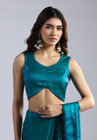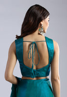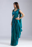 This striking teal saree is crafted from translucent, crisp organza, offering a lightweight feel with a regal, voluminous drape. It features a unique, large-scale illustrative print and is finished with meticulous hand-embellished borders.