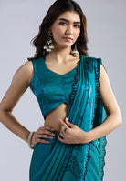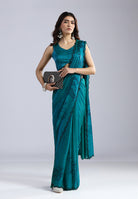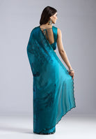 Teal Radiance Hand-Printed Organza Saree with Scalloped Beadwork