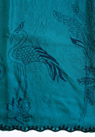 The Print: Artistic hand-drawn motifs of graceful cranes, tropical leaves, and lotus blooms in a deep Teal blue, creating a sophisticated "monochromatic" contrast against the teal base.