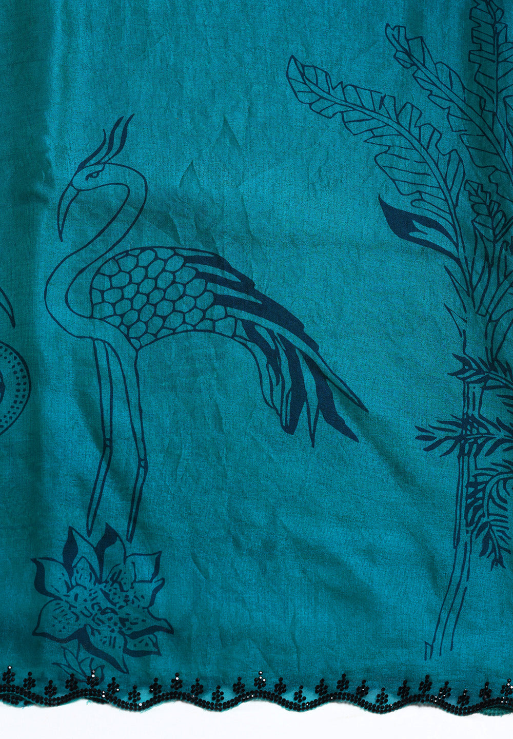 The Border: A delicate scalloped edge adorned with shimmering black beadwork (cut-dana or seed beads), adding a touch of evening-ready sparkle.