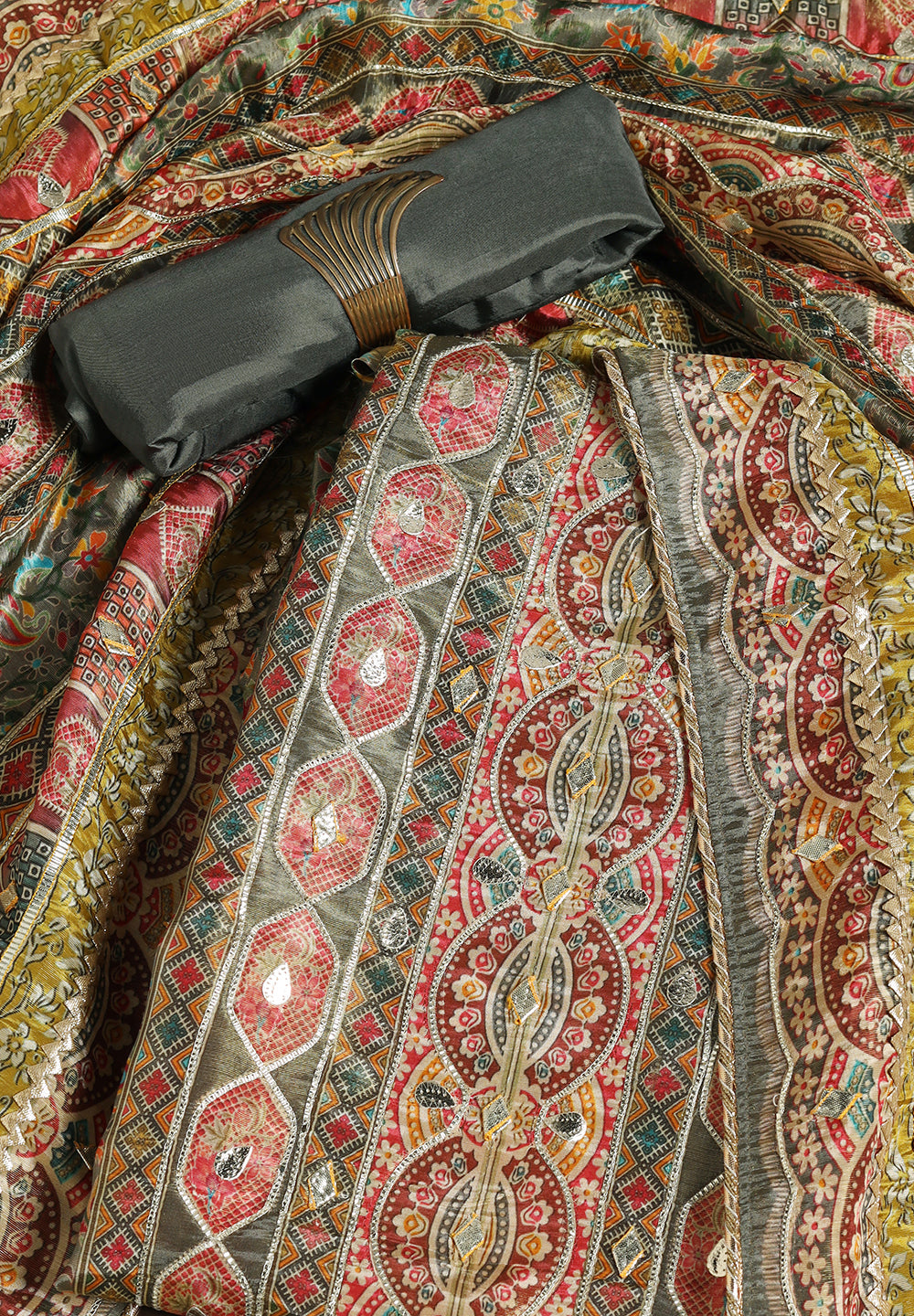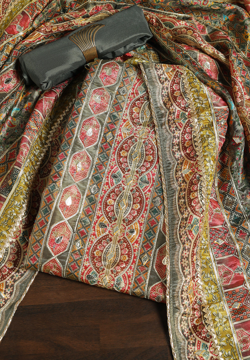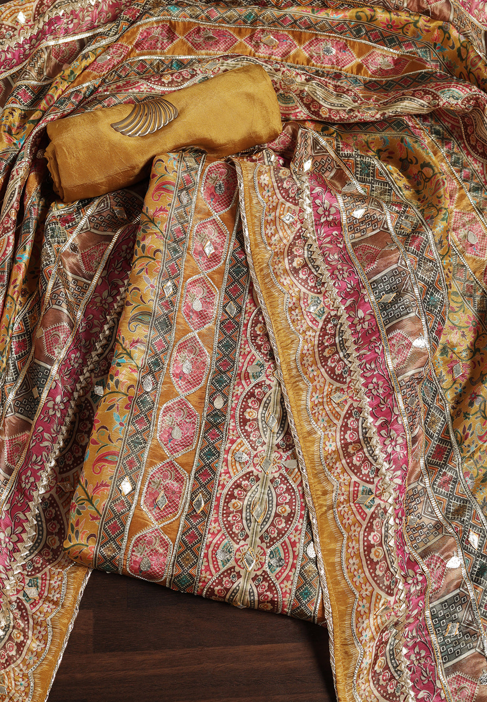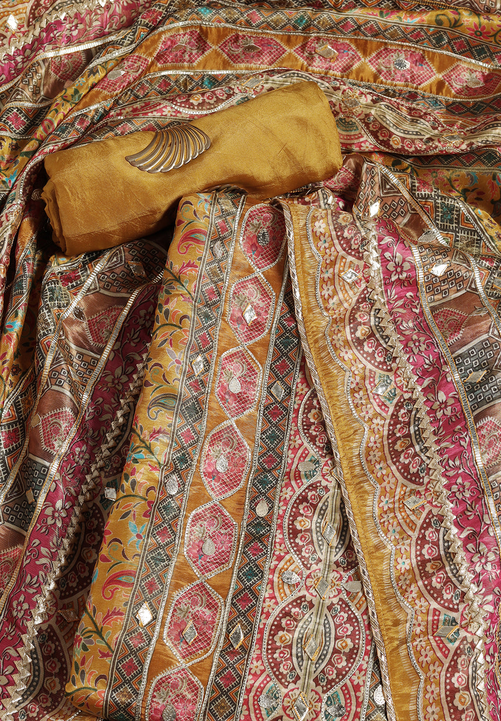 Experience the allure of Crepe with our Unstitched Uppada Silk Suit, featuring Gota Patti work. Accompanied by an unstitched Satin Silk bottom and a Silk Dupatta, this ensemble embodies timeless elegance. The Dupatta's Silk Gota Patti Work adds a delightful touch, creating a charming and sophisticated look. Available in Grey, Mustard, and Rani Color.