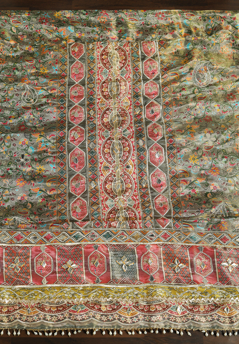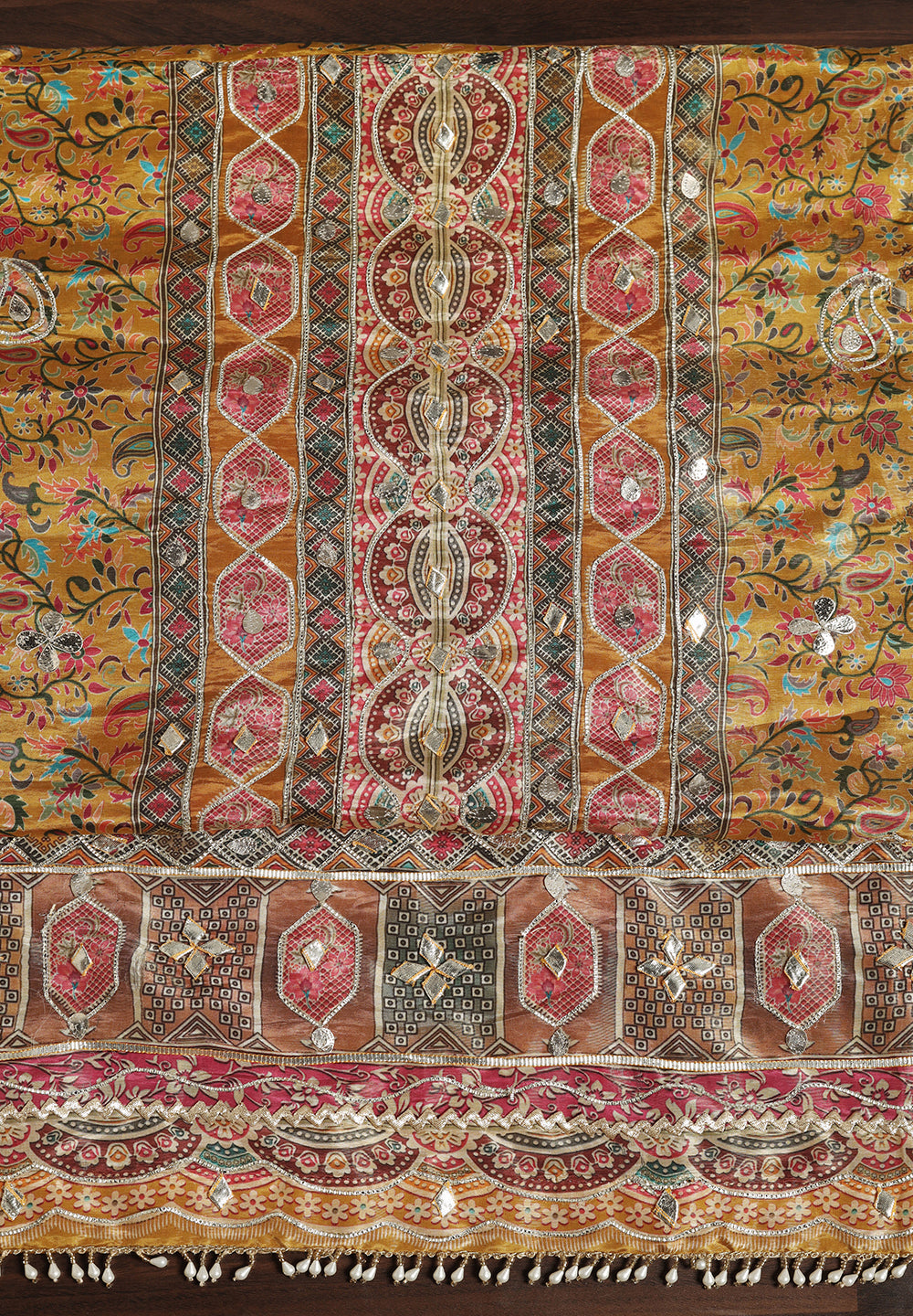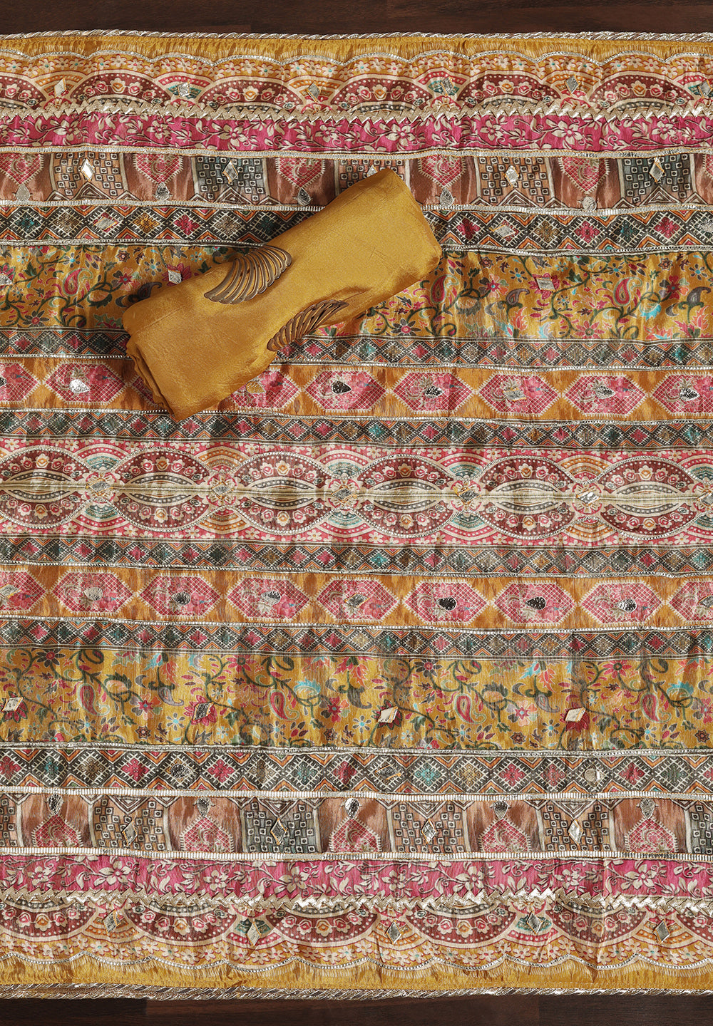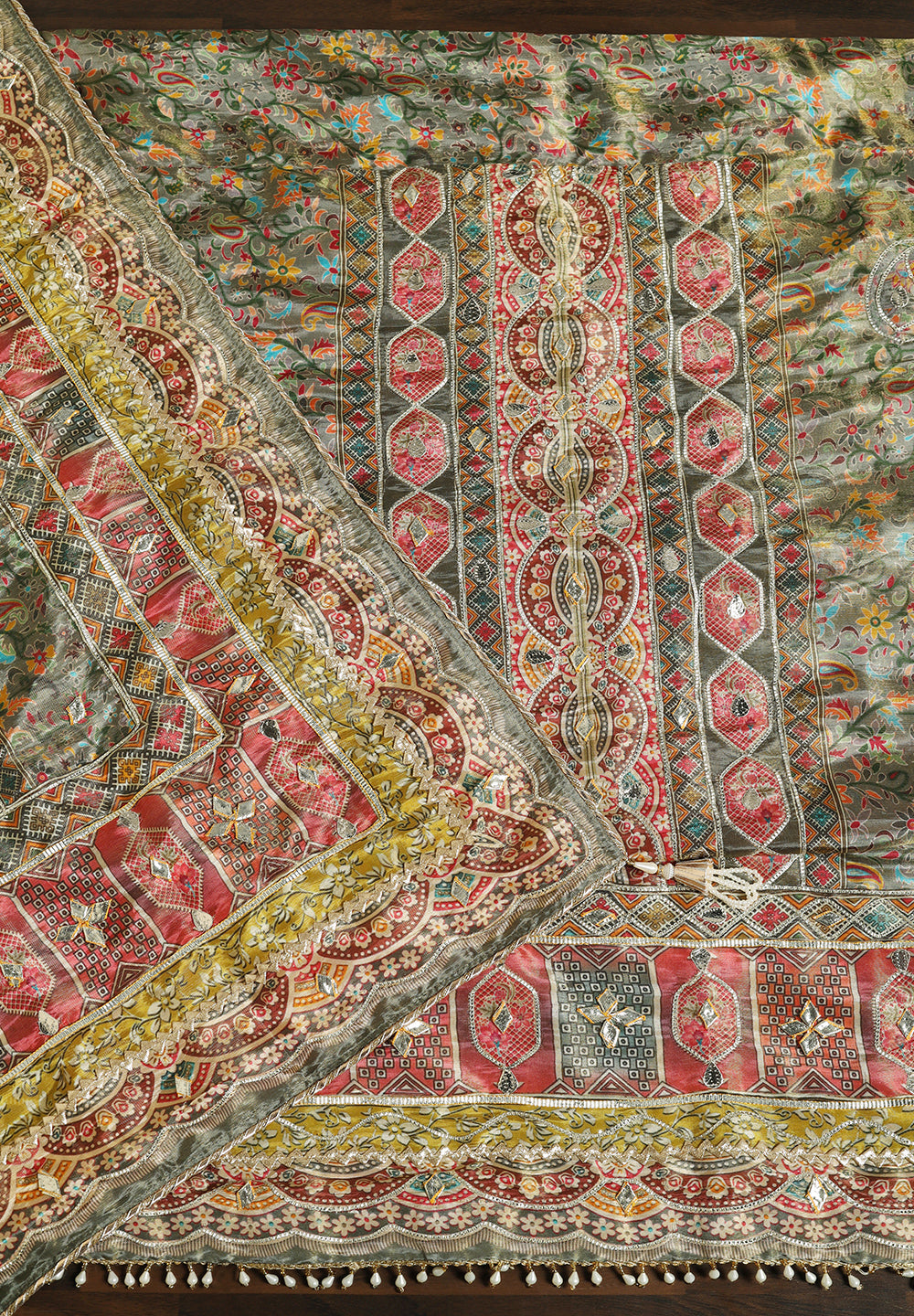 Experience the allure of Crepe with our Unstitched Uppada Silk Suit, featuring Gota Patti work. Accompanied by an unstitched Satin Silk bottom and a Silk Dupatta, this ensemble embodies timeless elegance. The Dupatta's Silk Gota Patti Work adds a delightful touch, creating a charming and sophisticated look. Available in Grey, Mustard, and Rani Color.